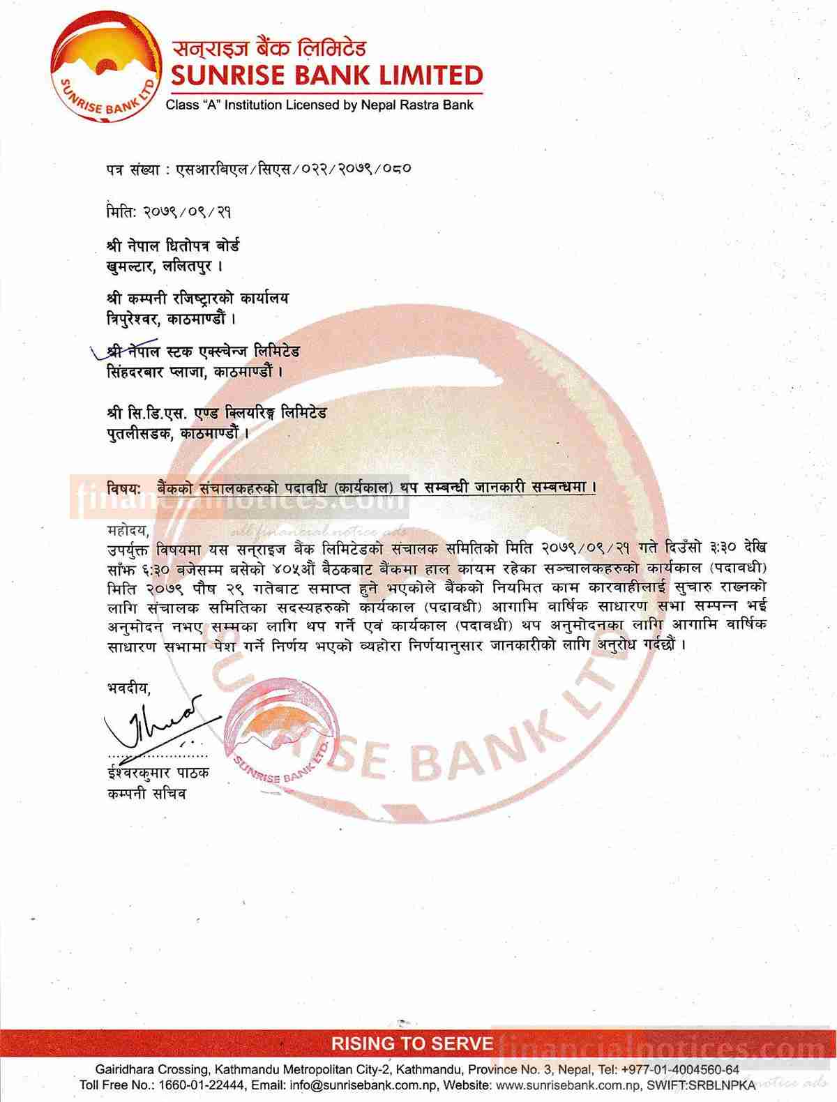 सन्राइज बैंकको संचालकहरुको कार्यकाल थप गरिएको सम्बन्धी सूचना