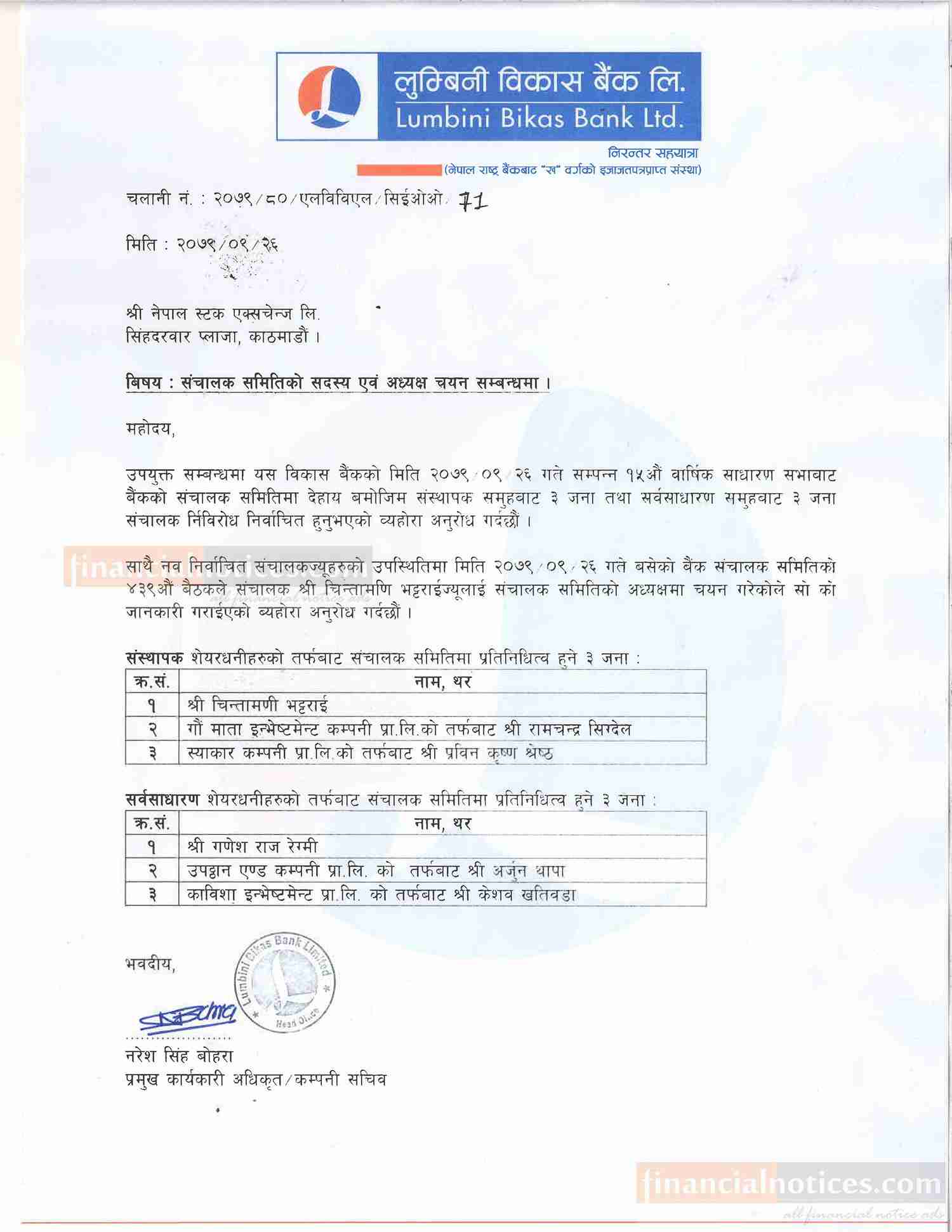 लुम्बिनी विकास बैंकको संचालक समितिको सदस्य एवं अध्यक्ष चयन भएको सम्बन्धी सूचना