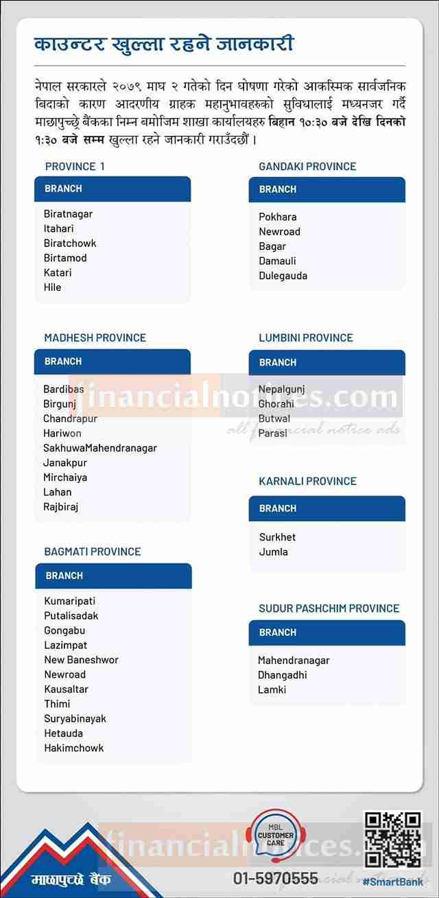 माछापुच्छ्रे बैंकको काउण्टर खुल्ला रहने सम्बन्धी महत्वपूर्ण सूचना