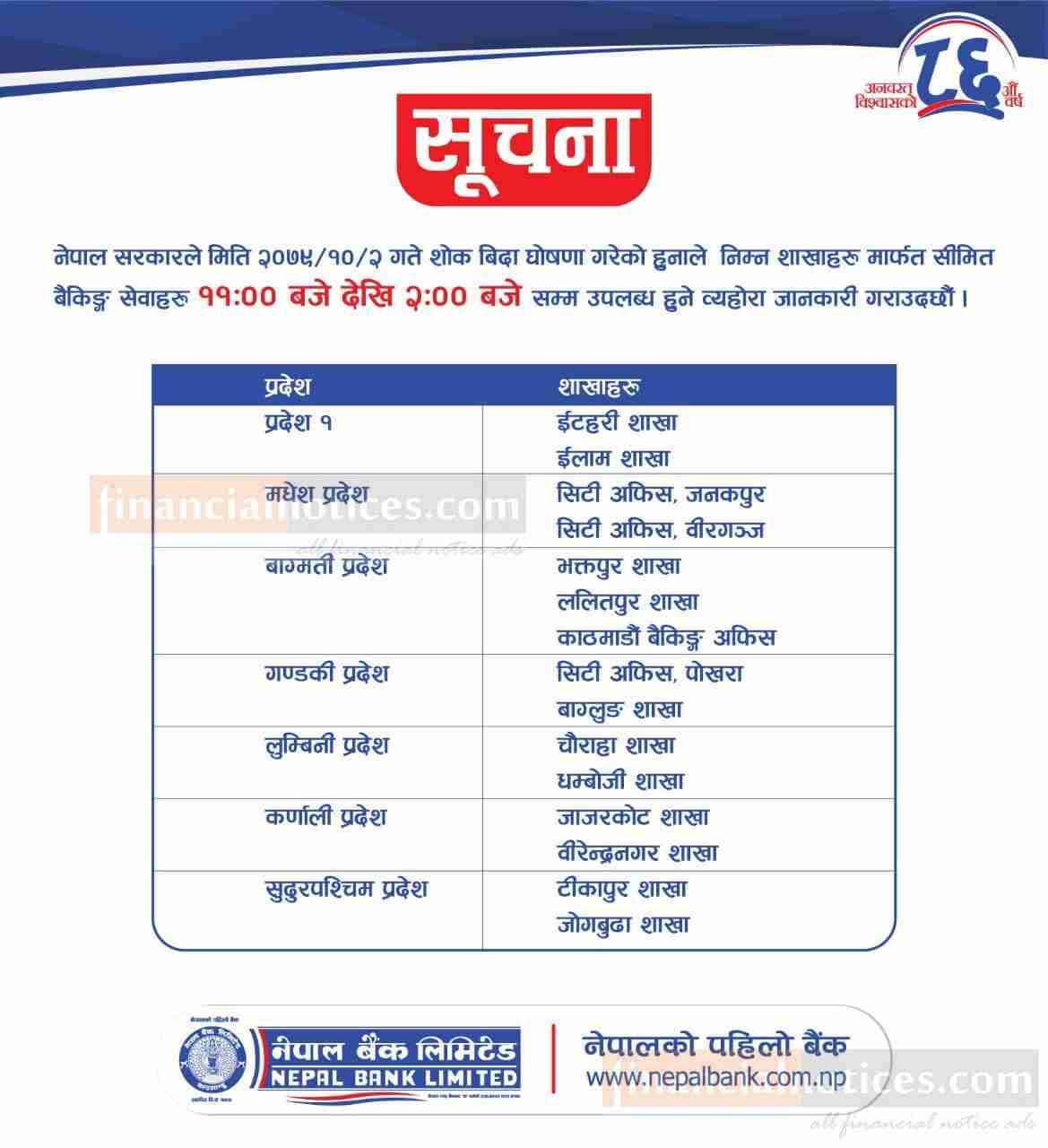 नेपाल बैंकको शाखा संचालन हुने समय तालिकाबारे सूचना