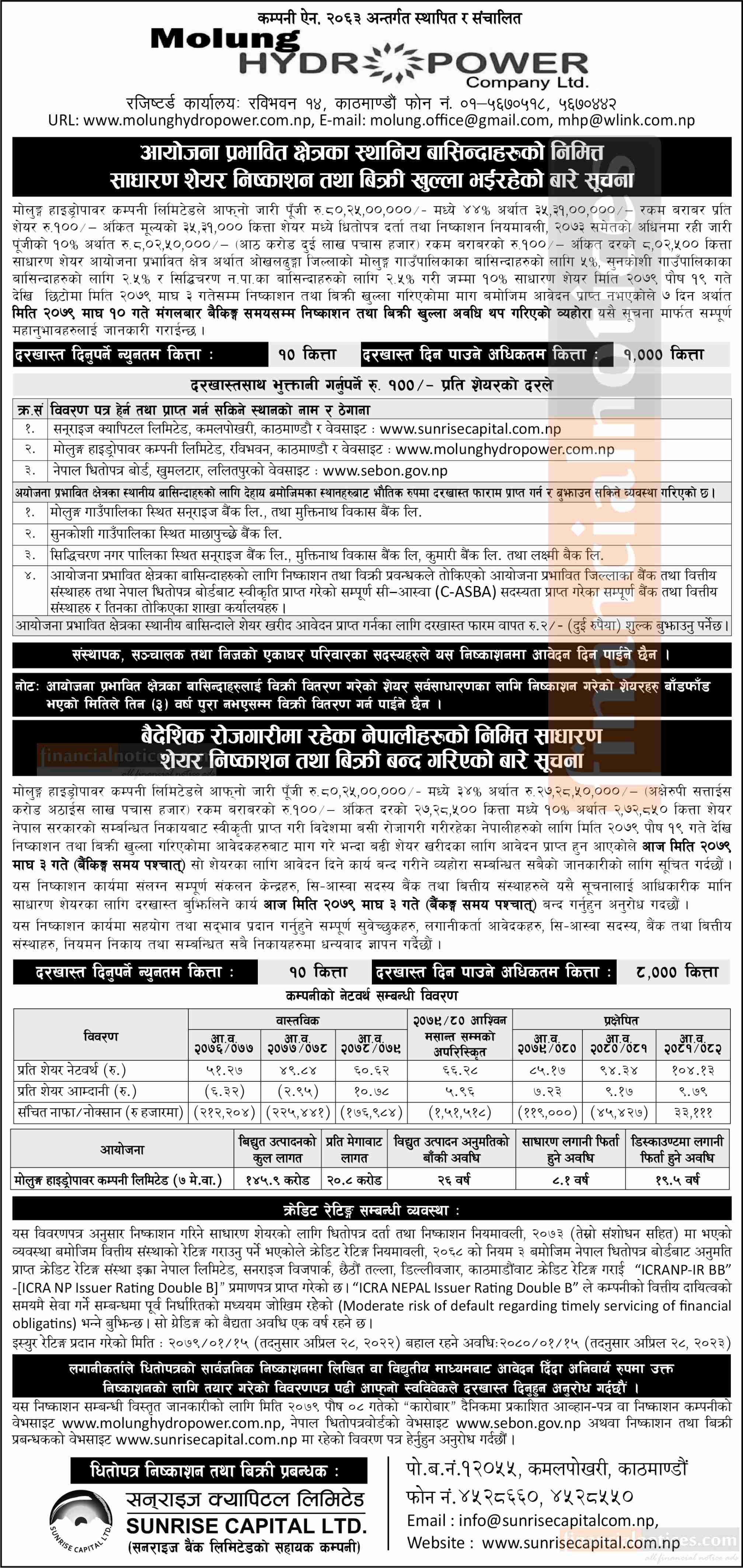 मोलुङ हाइड्रोपावरको आइपीओ वैदेशिक रोजगारीमा गएकाले आजसम्म आवेदन दिन सक्ने तथा स्थानीयलाई समय थपबारे