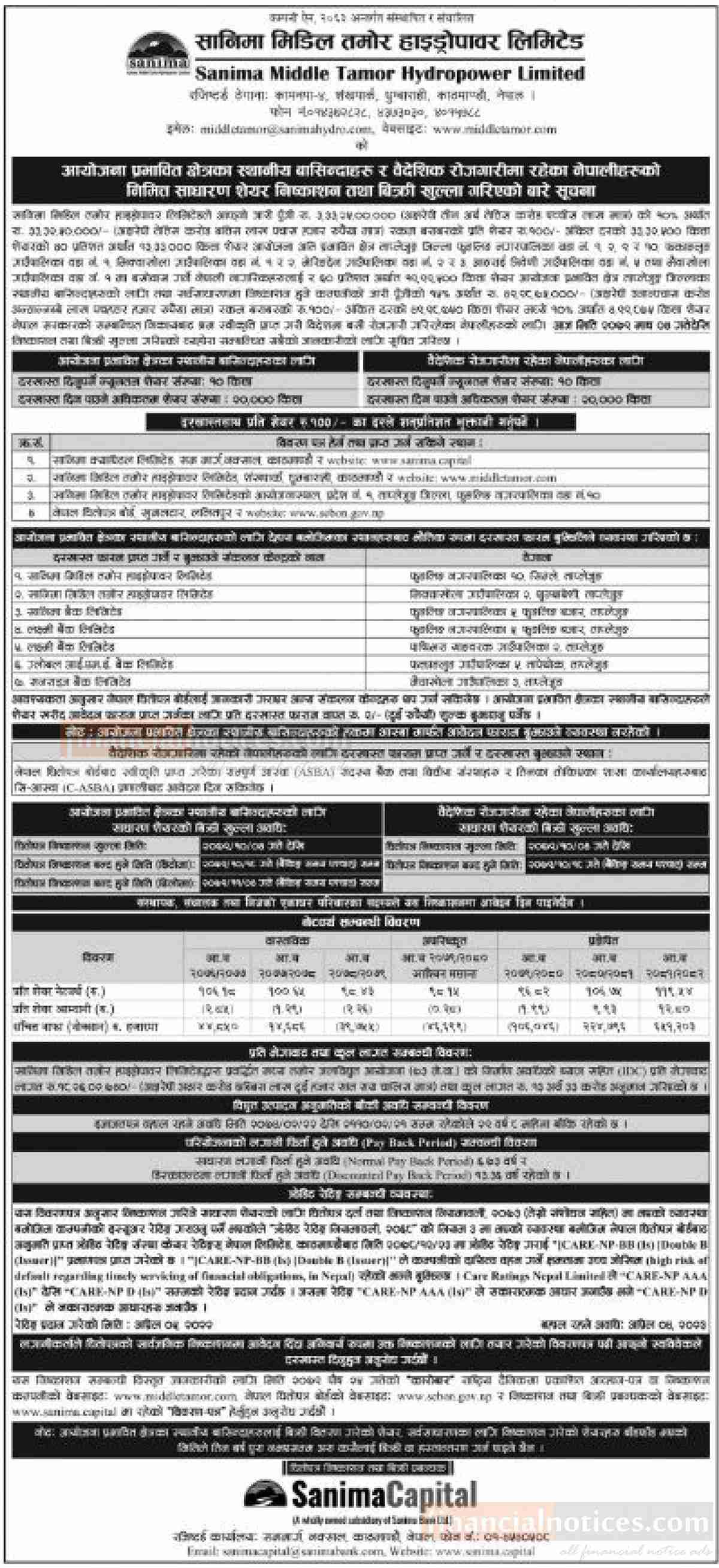 सानिमा मिडिल तमोरको आइपीओ आजबाट बिक्री खुला सम्बन्धी सूचना