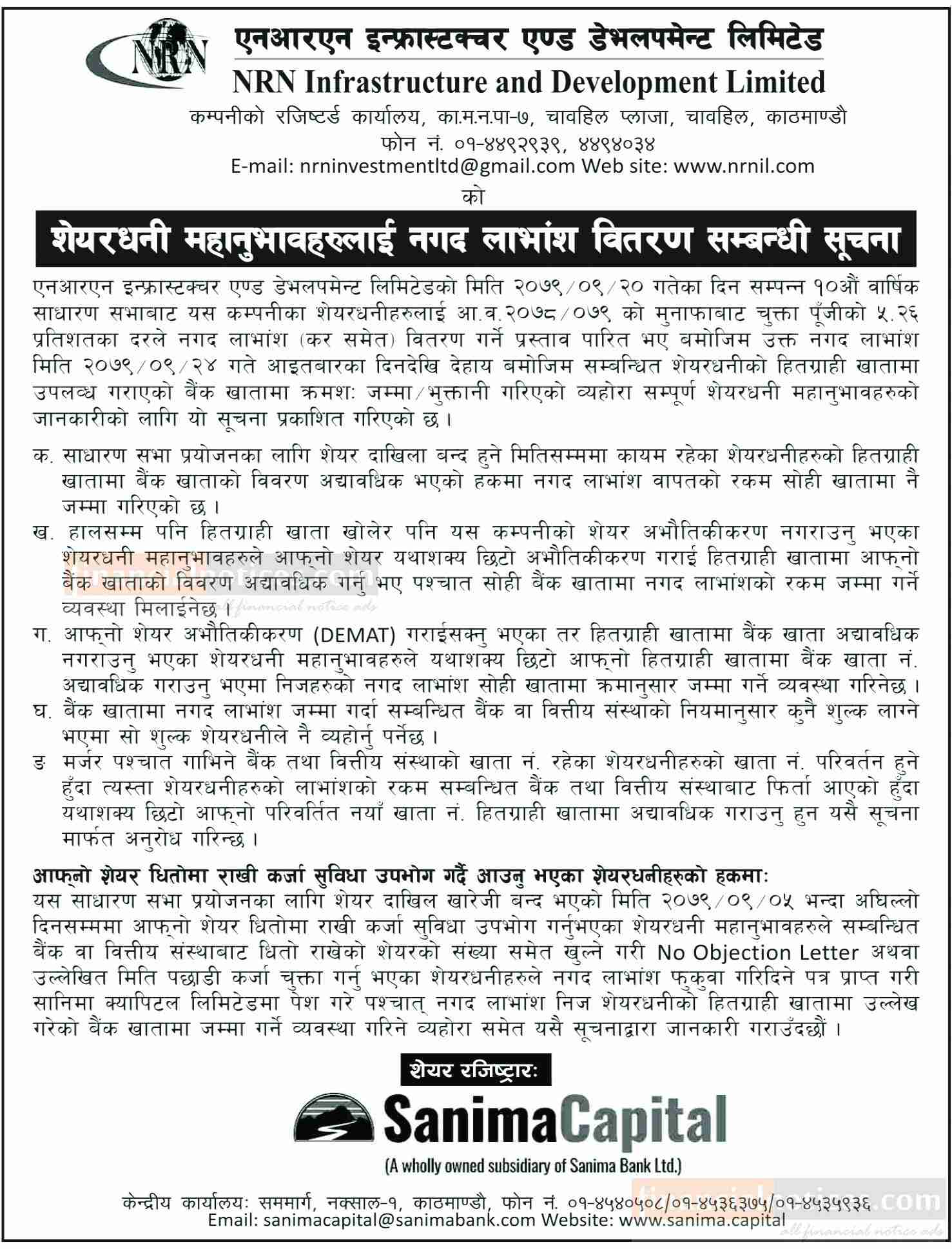 एनआरएम इन्फ्रास्टक्चरको शेयरधनीहरुलाई नगद लाभांश वितरण सम्बन्धी सूचना