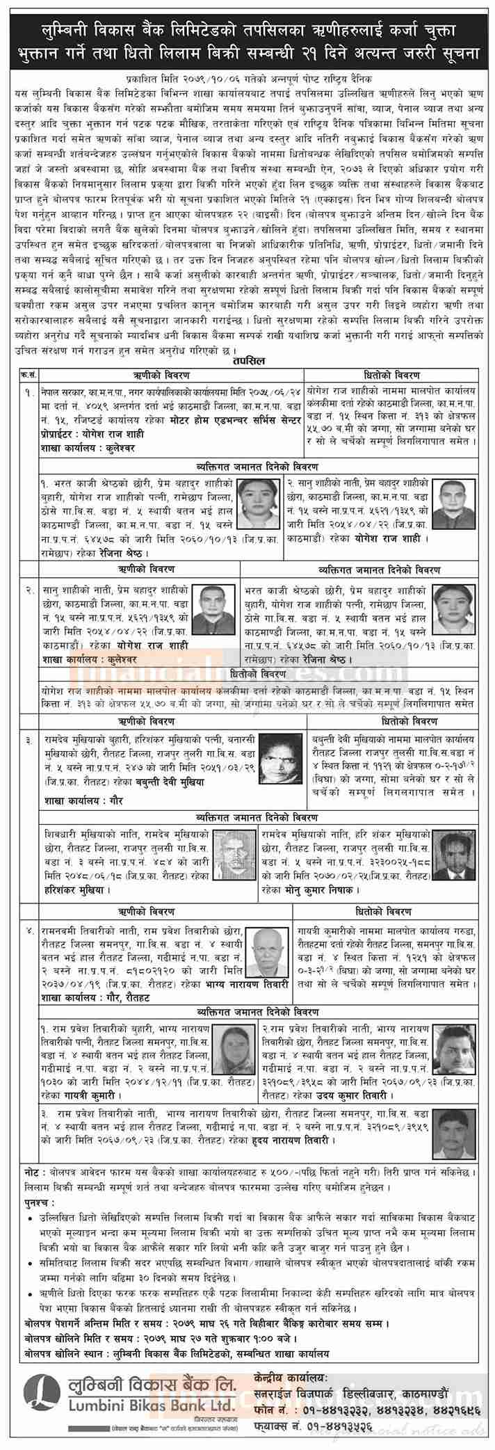 लुम्बिनी विकास बैंकको ऋणीहरुलाई कर्जा चुक्ता भुक्तान गर्ने तथा धितो लिलाम बिक्रीको सूचना