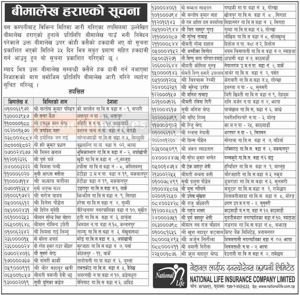 बीमालेख हराएको सम्बन्धी सूचना