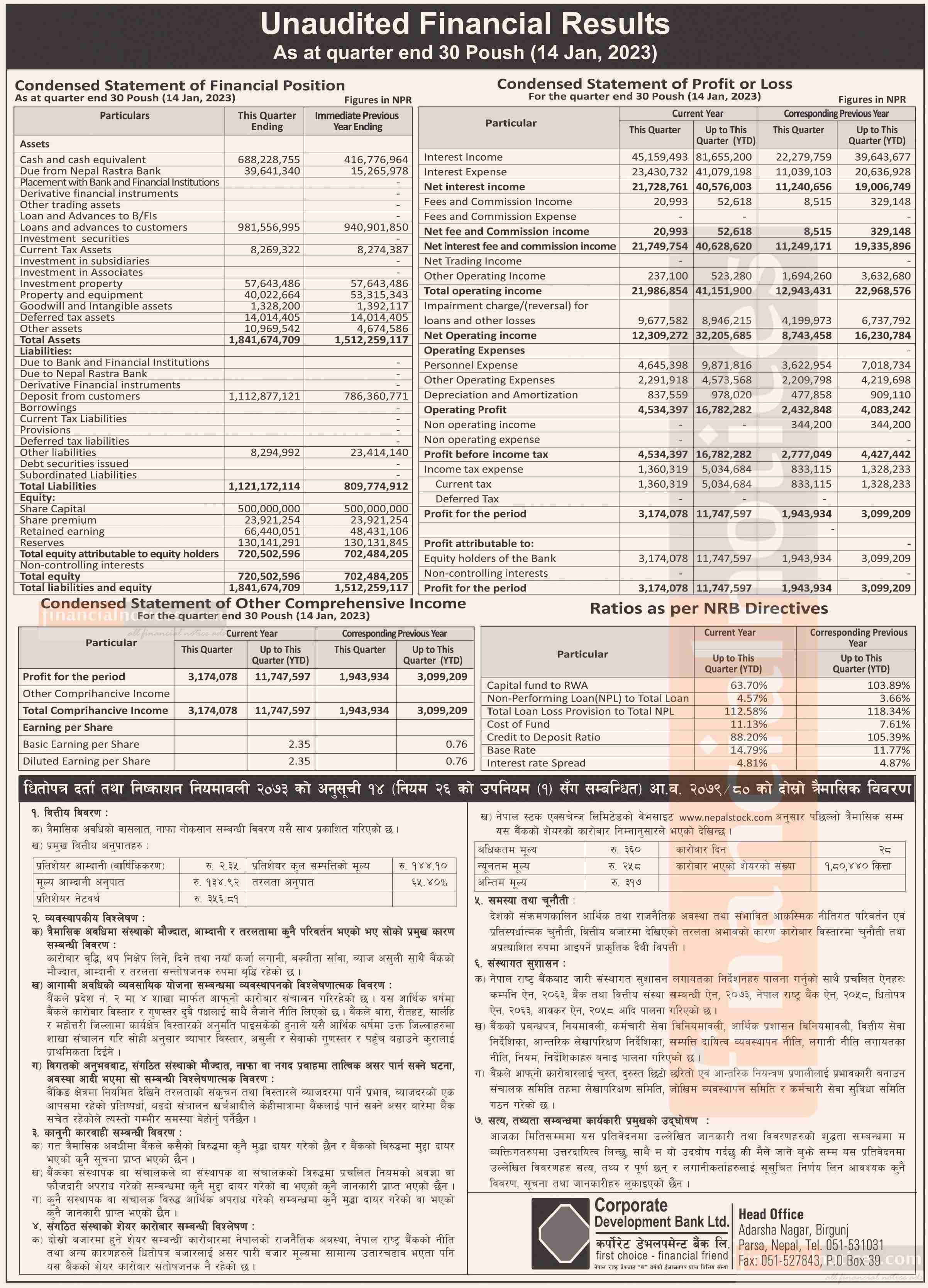 कर्पोरेट डेभलपमन्ट बैंकको खुद नाफा १ करोड १७ लाख रुपैयाँ - Q2 Report -