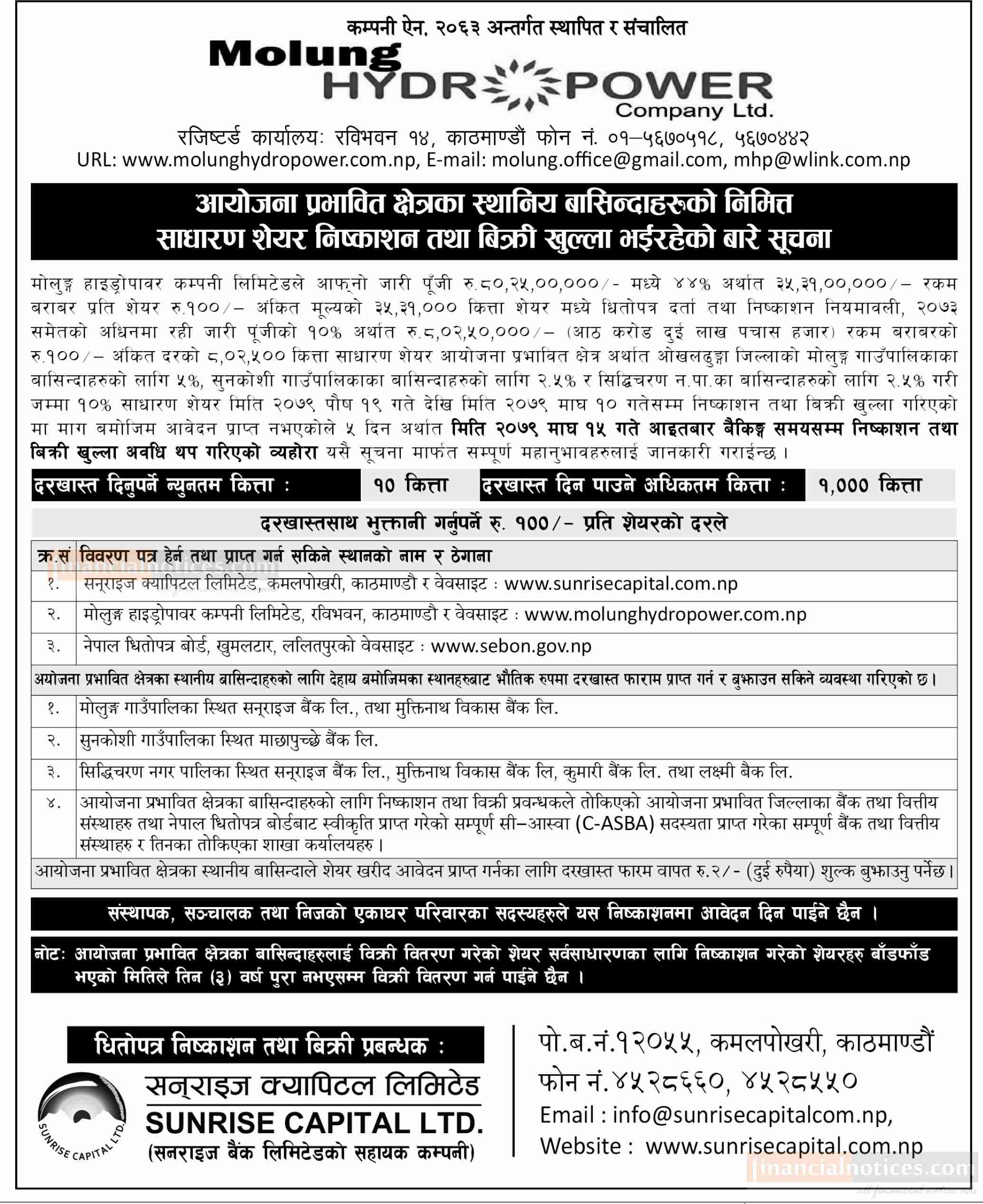 मोलुङ हाइड्रोपावरको साधारण शेयर निष्काशन तथा बिक्री खुल्ला भईरहेकोबारे सूचना