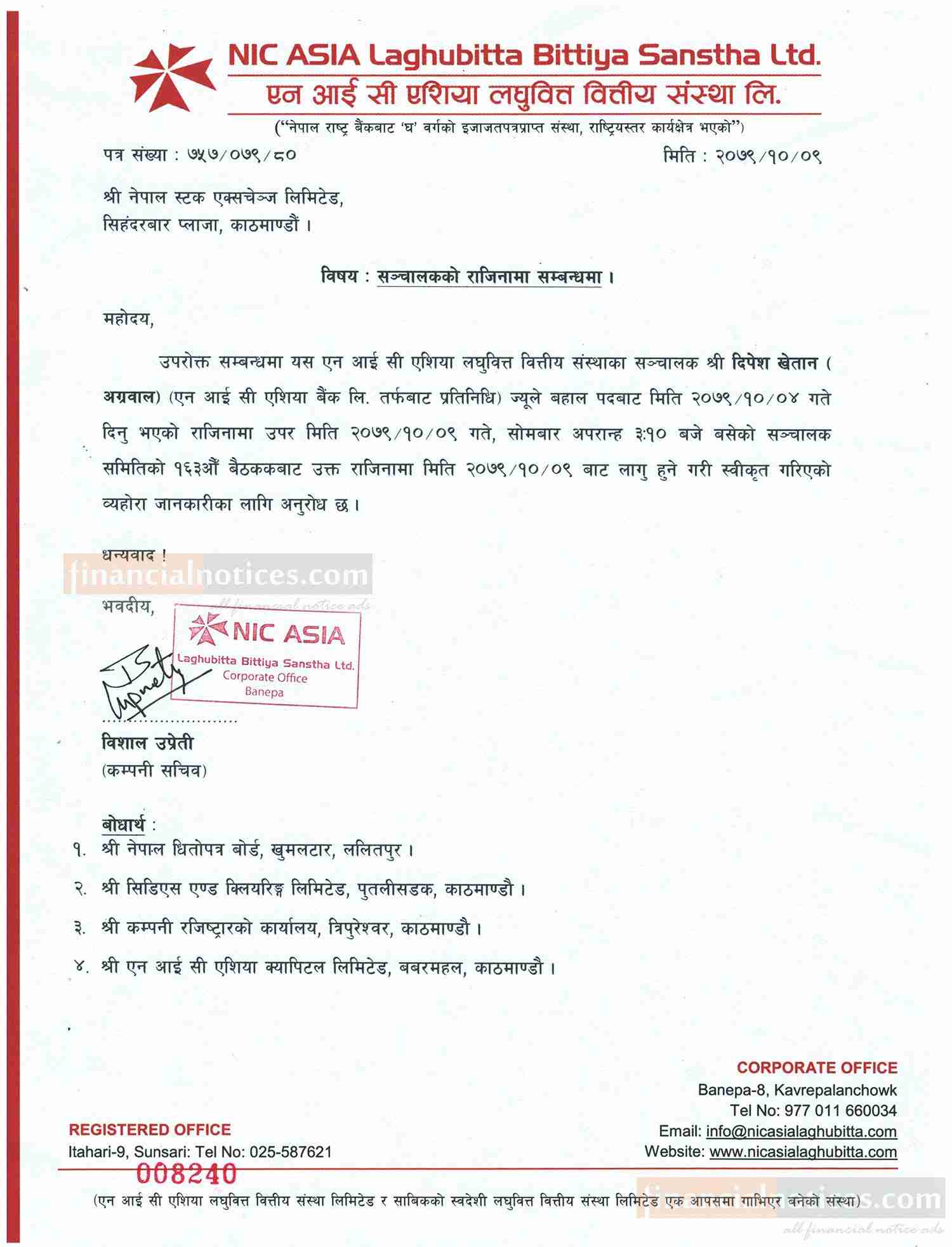 लघुवित्तमा संचालकको राजिनामा सम्बन्धी सूचना