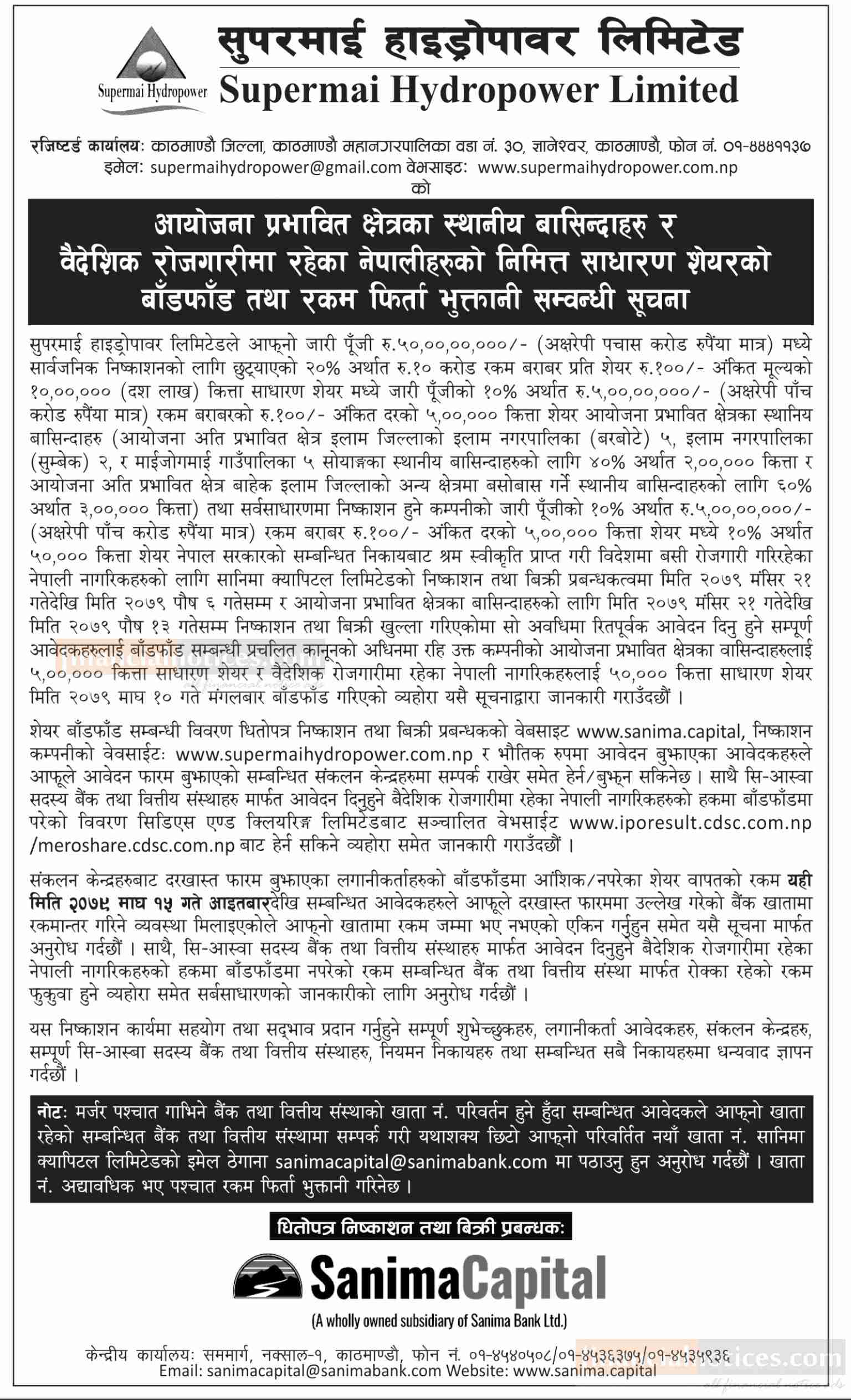 सुपरमाई हाइड्रोपावरको साधारण शेयरको बाँडफाँड तथा रकम फिर्ताबारे सूचना