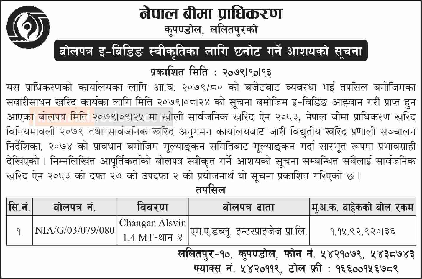 नेपाल बीमा प्राधिकरणको बालपत्र इ–बिडिङका लागि छनोट गर्ने आशयको सूचना