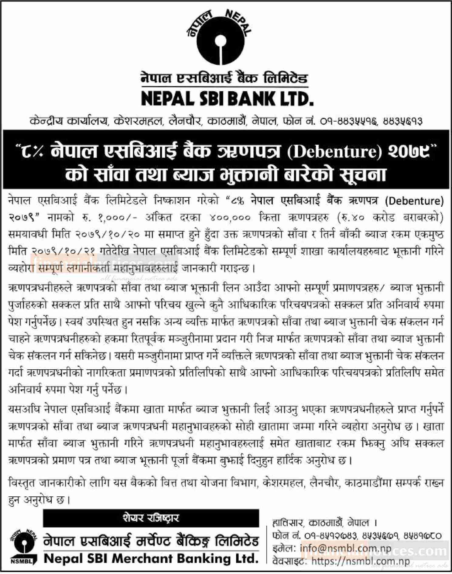 ८% नेपाल एसबिआई बैंक ऋणपत्र २०७९ को साँवा तथा ब्याज भुक्तानी बारेको सूचना