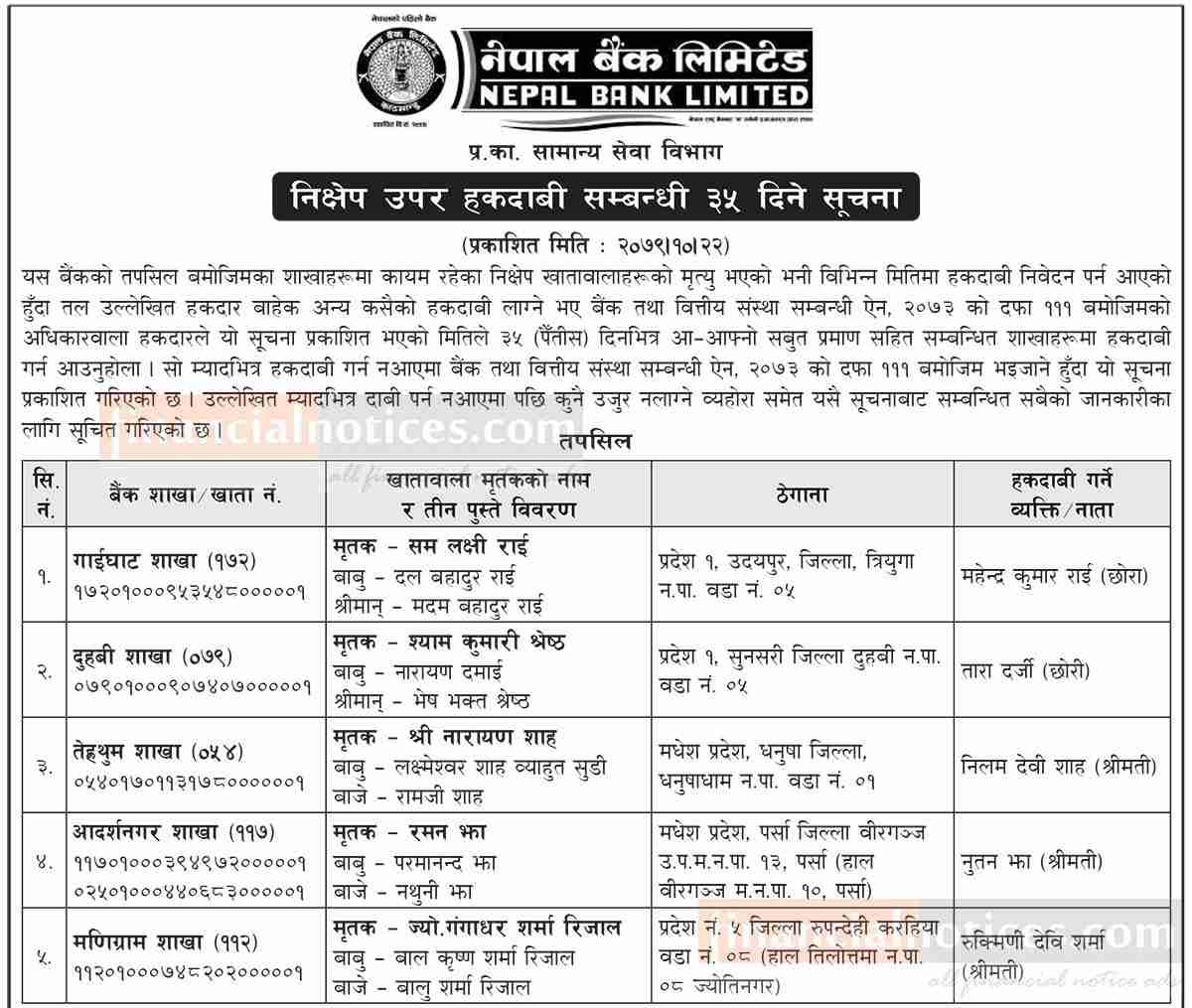 निक्षेप उपर हकदावी सम्बन्धी ३५ दिने सूचना