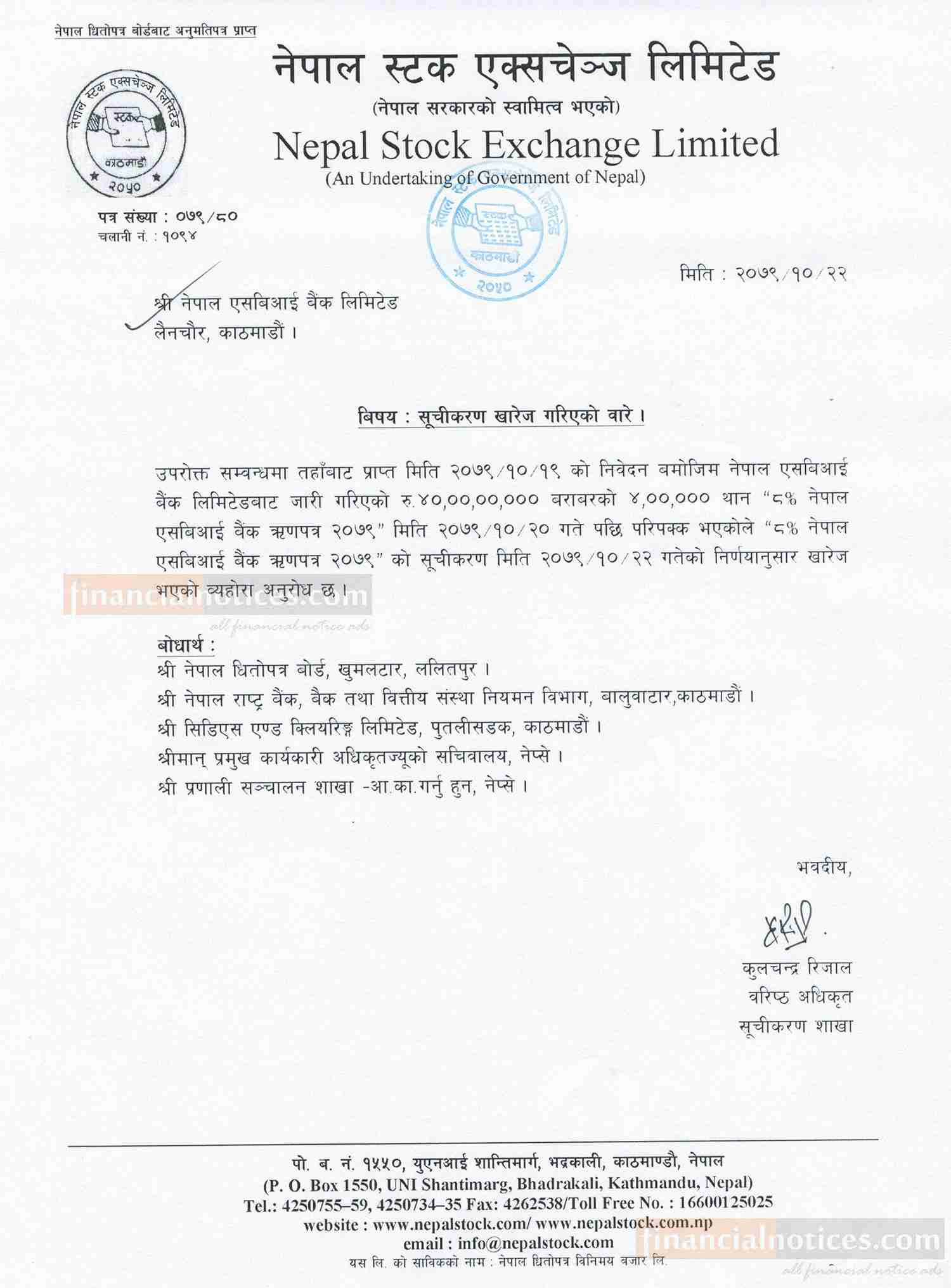 नेप्सेमा नेपाल एसबिआई बैंक लिमिटेडको ४ लाख कित्ता ऋणपत्र सूचीकरण खारेज गरिएको छ । बैंकले जारी गरेकाे ऋणपत्र परिपक्क भएकाले सूचीकरण खारेज गरिएको हाे । स्टकका अनुसार बैंकले "८% नेपाल एसबिआई बैंक ऋणपत्र, २०७९" नाममा जारी गरेकाे ४० कराेड रूपैयाँ बराबरकाे ४ लाख कित्ता ऋणपत्र माघ २२ गतेपछि परिपक्क भएकाे हाे ।