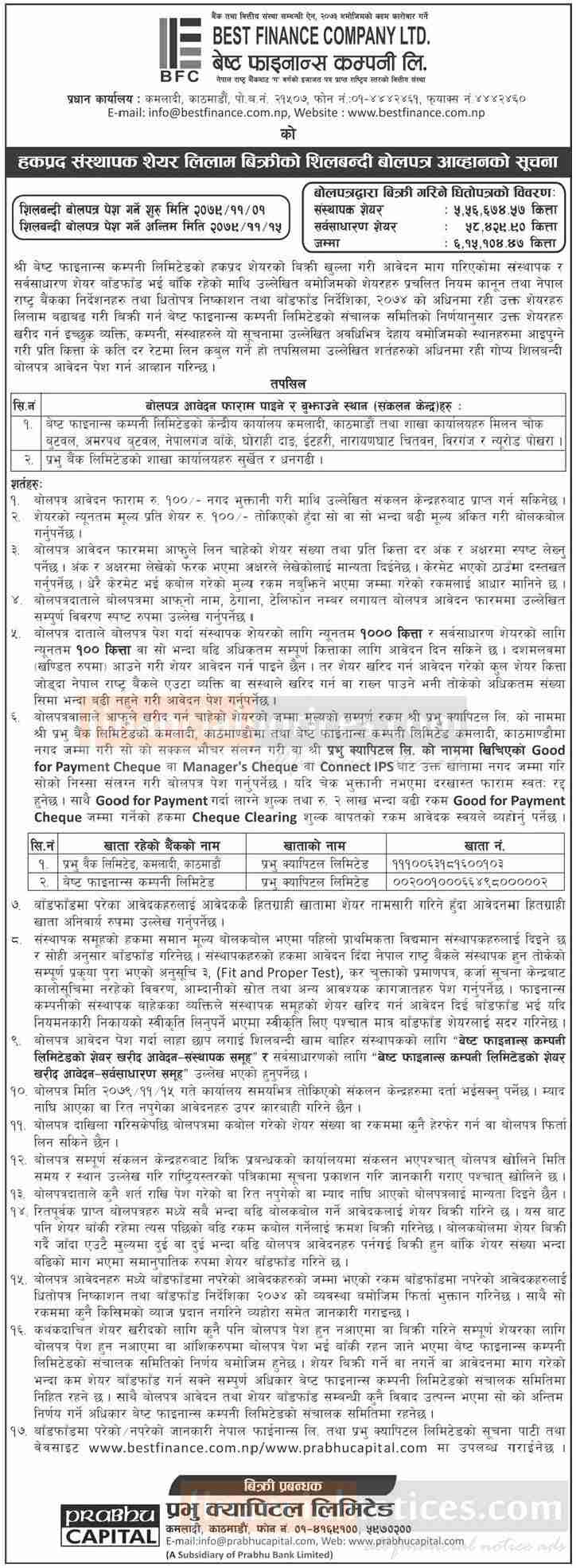 बेष्ट फाइनान्सको ६ लाख १५ हजार कित्ता सेयर लिलाम गर्ने सम्बन्धी सूचना