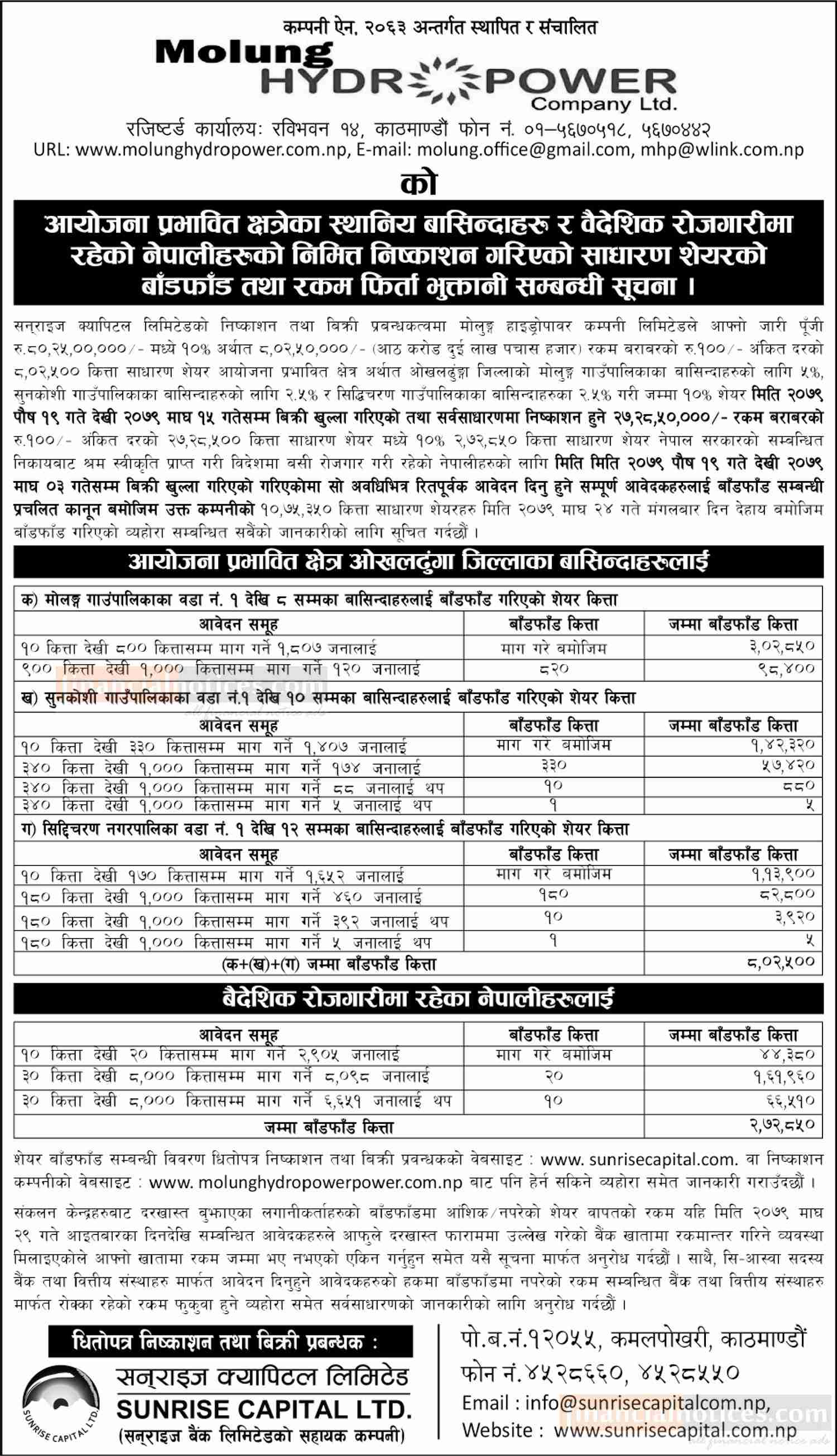 मोलुङ हाइड्रोपावरले प्रभावित क्षेत्रहरुलाई निष्काशन गरेको IPO बाँडफाँड सम्बन्धी सूचना