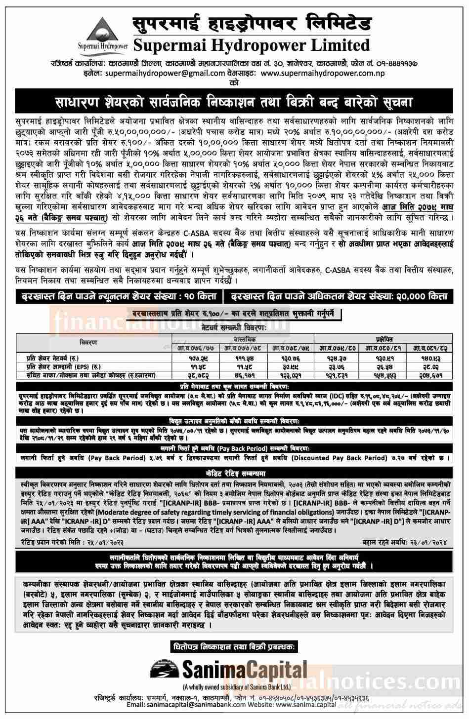 सुपरमाई हाइड्रोपावर लिमिटेडले माघ २३ गतेदेखि निष्काशन तथा बिक्री खुला गरेको आईपीओमा आवेदन दिने आज अर्थात माघ २६ गते अन्तिम दिन रहेको सूचना प्रकाशित भएको छ। कम्पनीले आफ्नो जारी पूँजी ५० करोड रुपैयाँको १० प्रतिशतले हुन आउने ५ करोड रुपैयाँ बराबरको ५ लाख कित्तामध्ये १० प्रतिशत अर्थात ५० हजार कित्ता वैदेशिक रोजगारीमा रहेको नेपालीहरुलाई, २५ हजार कित्ता सामूहिक लगानी कोषहरुलाई बाँडफाँट गरी २ प्रतिशत अर्थात १० हजार कित्ता शेयर कम्पनीमा कार्यरत कर्मचारीहरुका लागि सुरक्षित गरी बाँकी रहने ४ लाख १५ हजार कित्ता साधारण शेयर सर्वसाधारणका लागि निष्काशन गरेको थियो ।