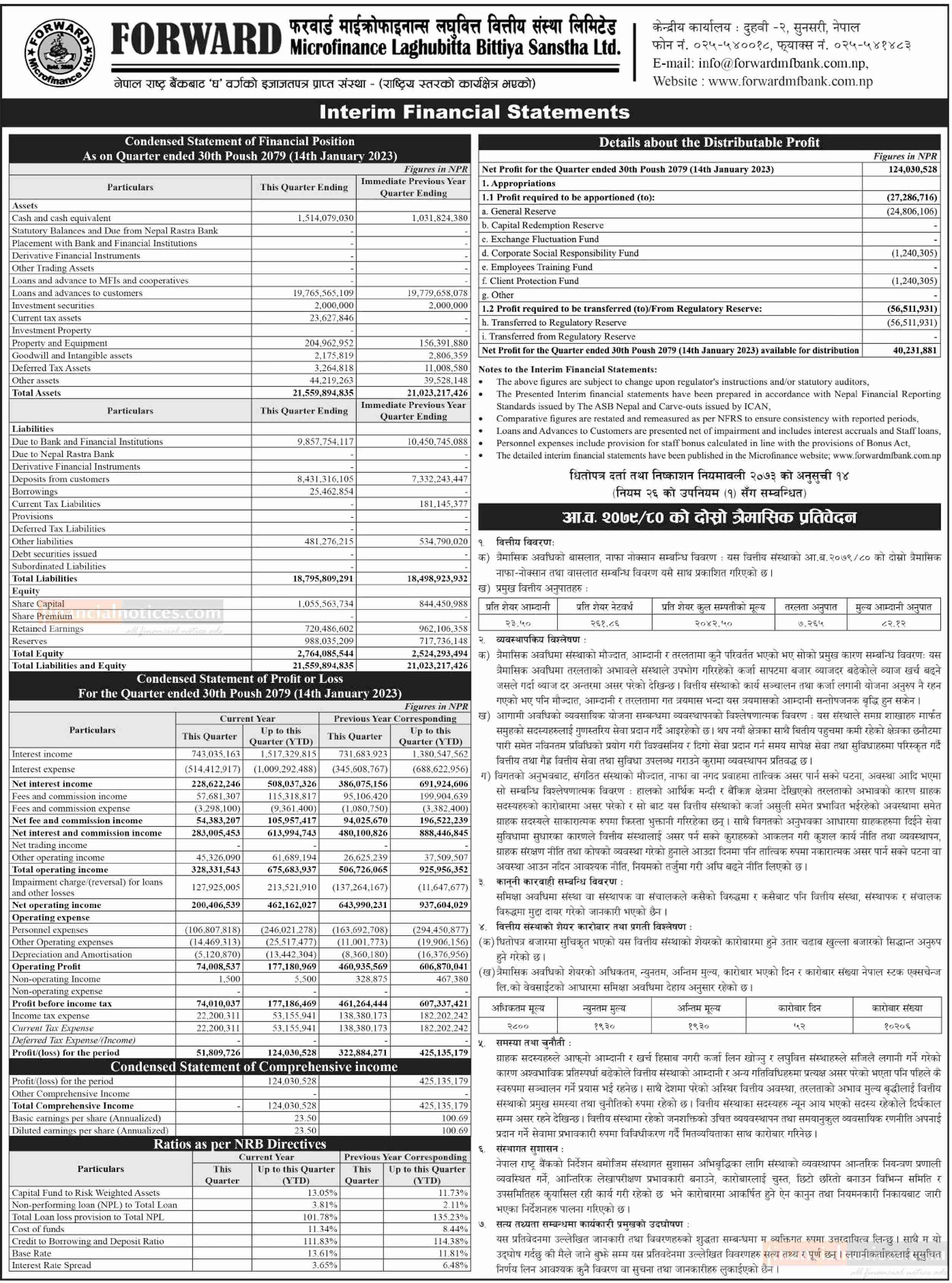 चालु आर्थिक वर्षको दोस्रो त्रैमाससम्म आइपुग्दा फरवार्ड माइक्रोफाइनान्स लघुवित्त वित्तीय संस्थाको खुद नाफा ७०.८३% ले घटेर १२ करोड ४० लाख ३० हजार रुपैयाँमा झरेको छ । गत आर्थिक वर्षको यसैअवधिमा कम्पनीले ४२ करोड ५१ लाख ३५ हजार रुपैयाँ खुद नाफा कमाएको थियो । यसअवधिमा संस्थाको खुद ब्याज आम्दानी र सञ्चालन नाफा घट्नाले यसको खुद मुनाफामा असर परेको हो । साथै, लघुवित्तले इम्पेयरमेन्ट चार्ज बापत २१ करोड ३५ लाख रुपैयाँ छुट्याएको छ । त्यसैले गर्दा पनि नाफामा केही संकुचन आएको हो ।