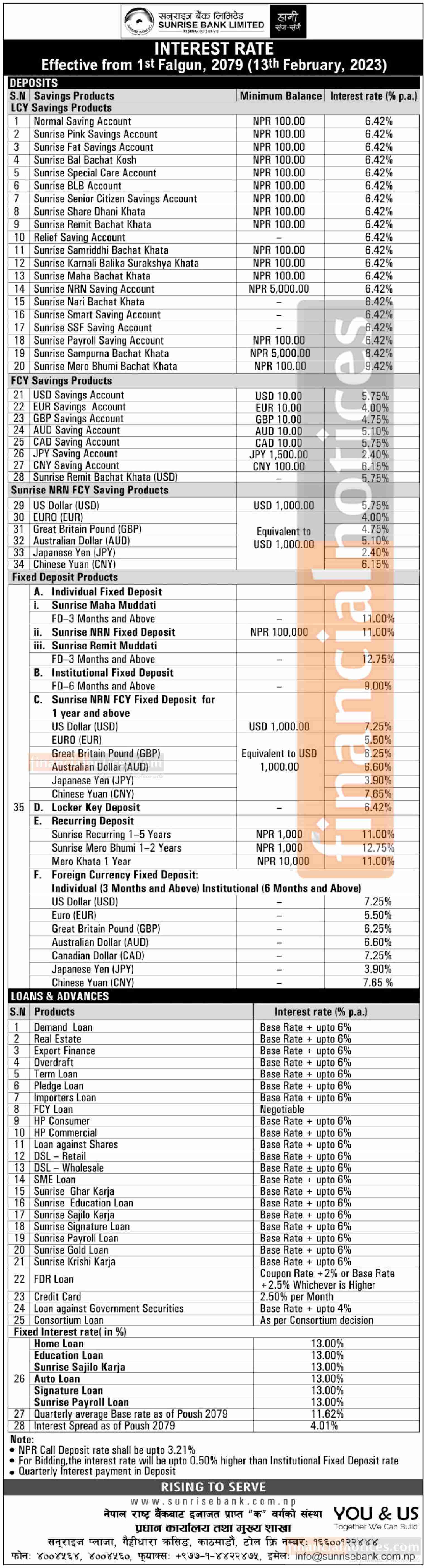 सनराइज बैंकको फागुन १ गतेदेखि लागुहुने गरी नयाँ ब्याजदर तालिका सार्वजनिक - Interest Rates -