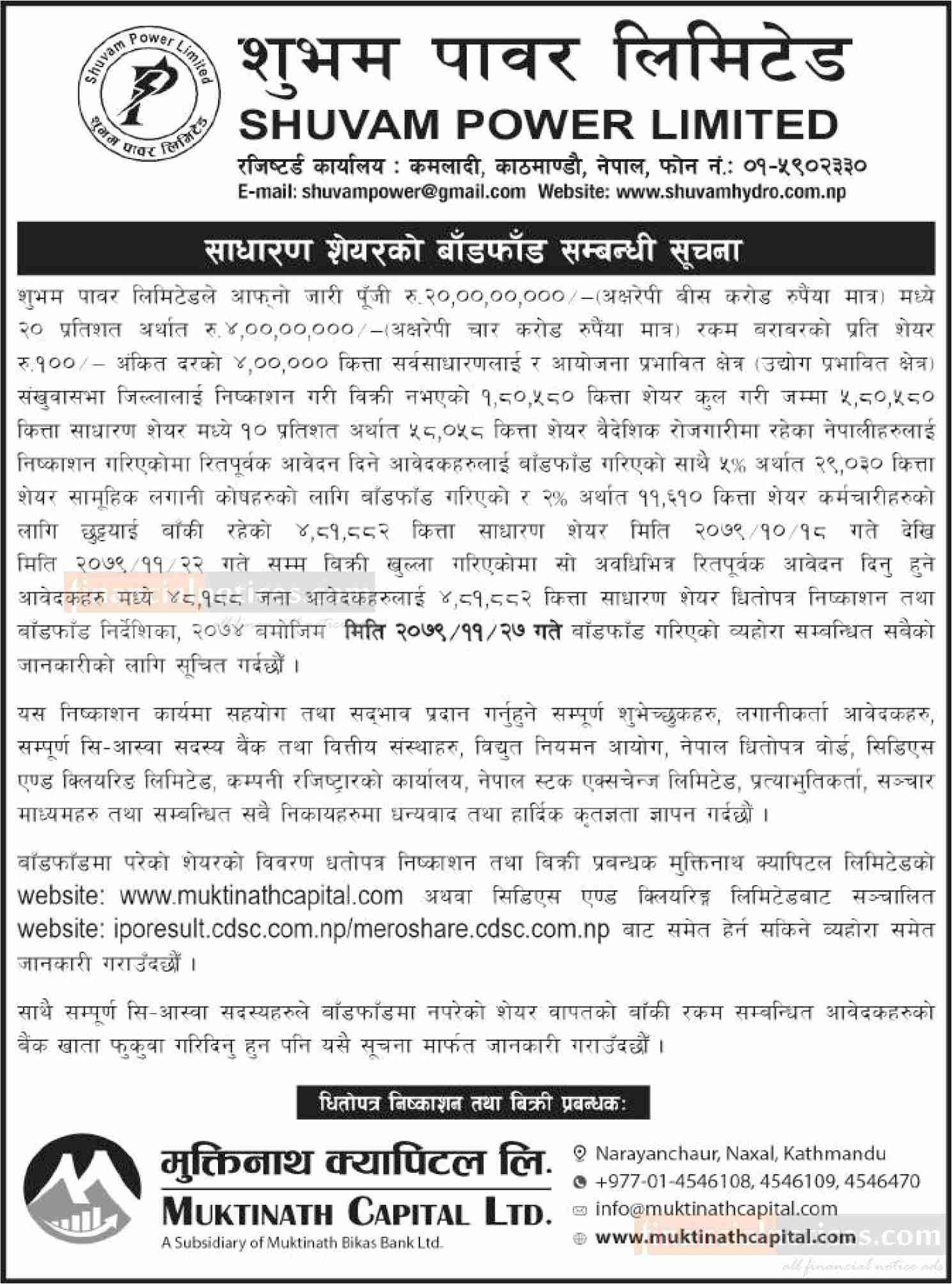 शुभम पावरको साधारण शेयरको बाँडफाँड सम्बन्धी सूचना