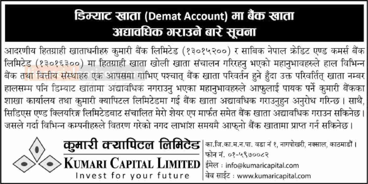 कुमारी क्यापिटको डि म्याट खातामा बैंक खाता अद्यावधिक गराउने बारेको सूचना