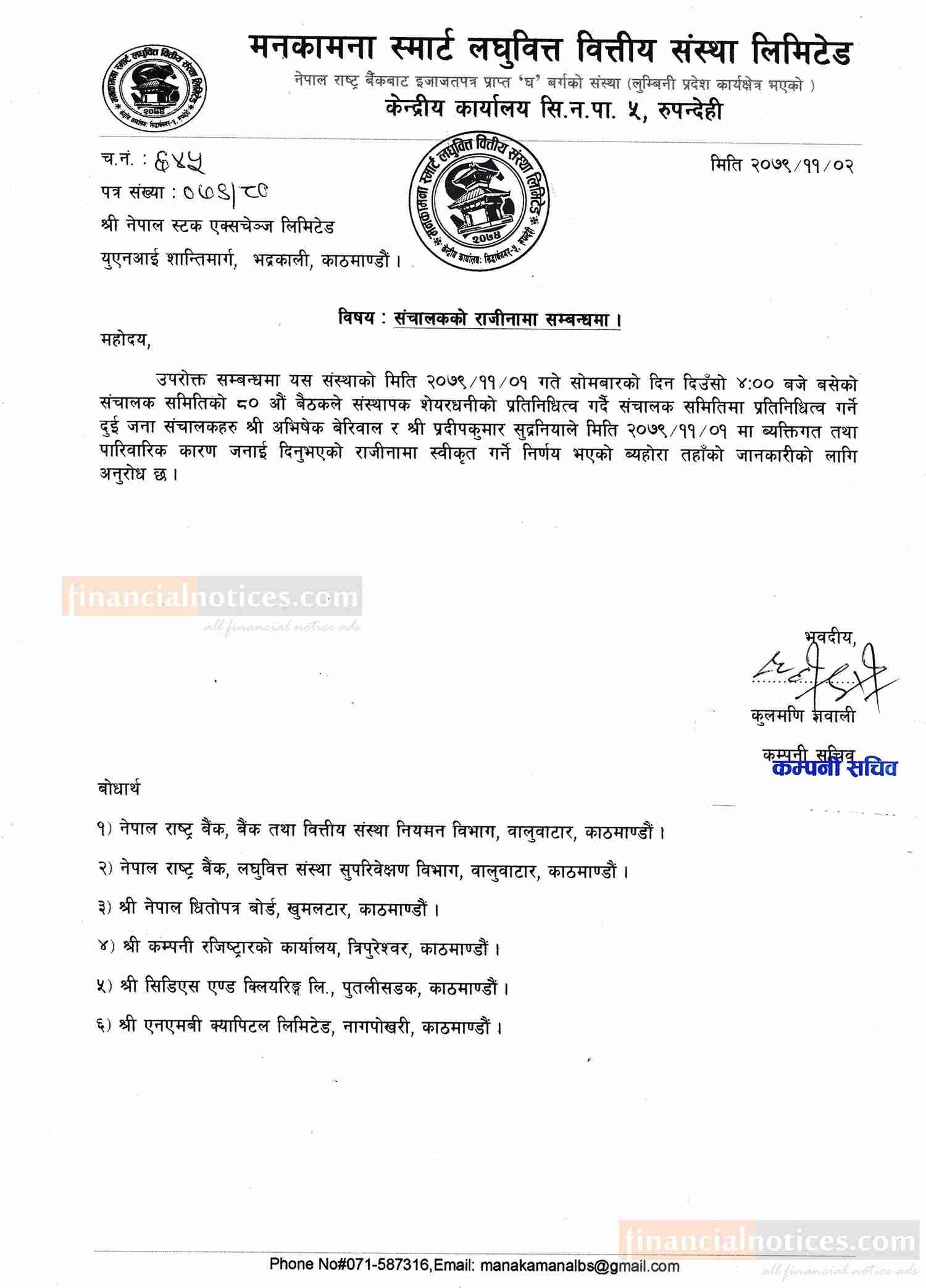 मनकामना स्मार्ट लघुवित्तको संचालकको राजिनामा सम्बन्धी सूचना