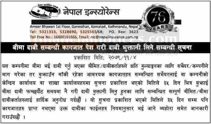बीमा दाबी सम्बन्धी कागजात पेश गरी दाबी भुक्तानी लिने बारेको सूचना