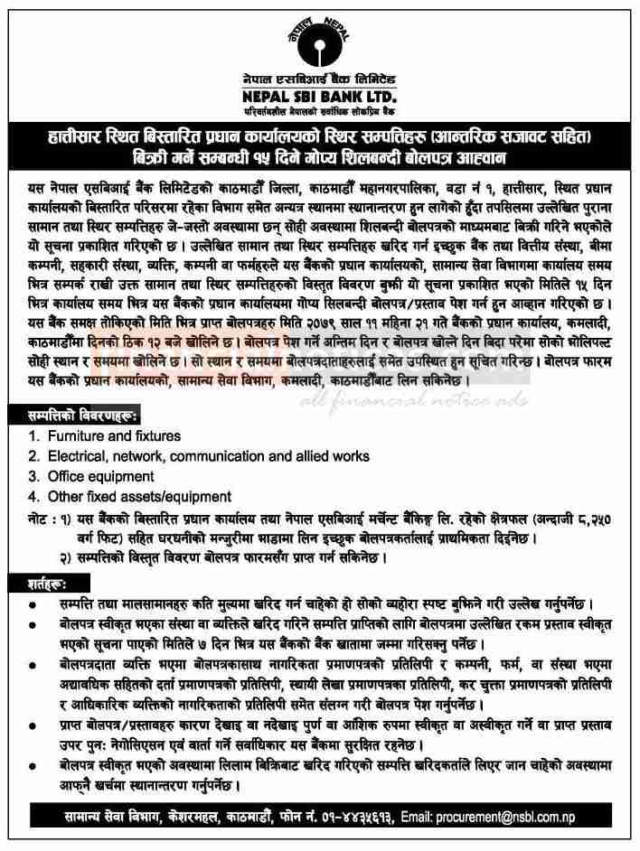 बैंकको स्थिर सम्पत्तीहरु बिक्री गर्ने सम्बन्धी शिलबन्दी बोलपत्र आह्वानबारे सूचना
