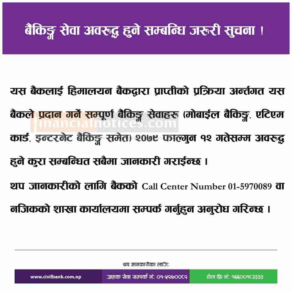 As part of the acquisition process of Civil Bank by Himalayan Bank, all the banking services provided by this bank, including mobile banking, ATM card, internet banking, will be suspended till 12th Falgun 2019.