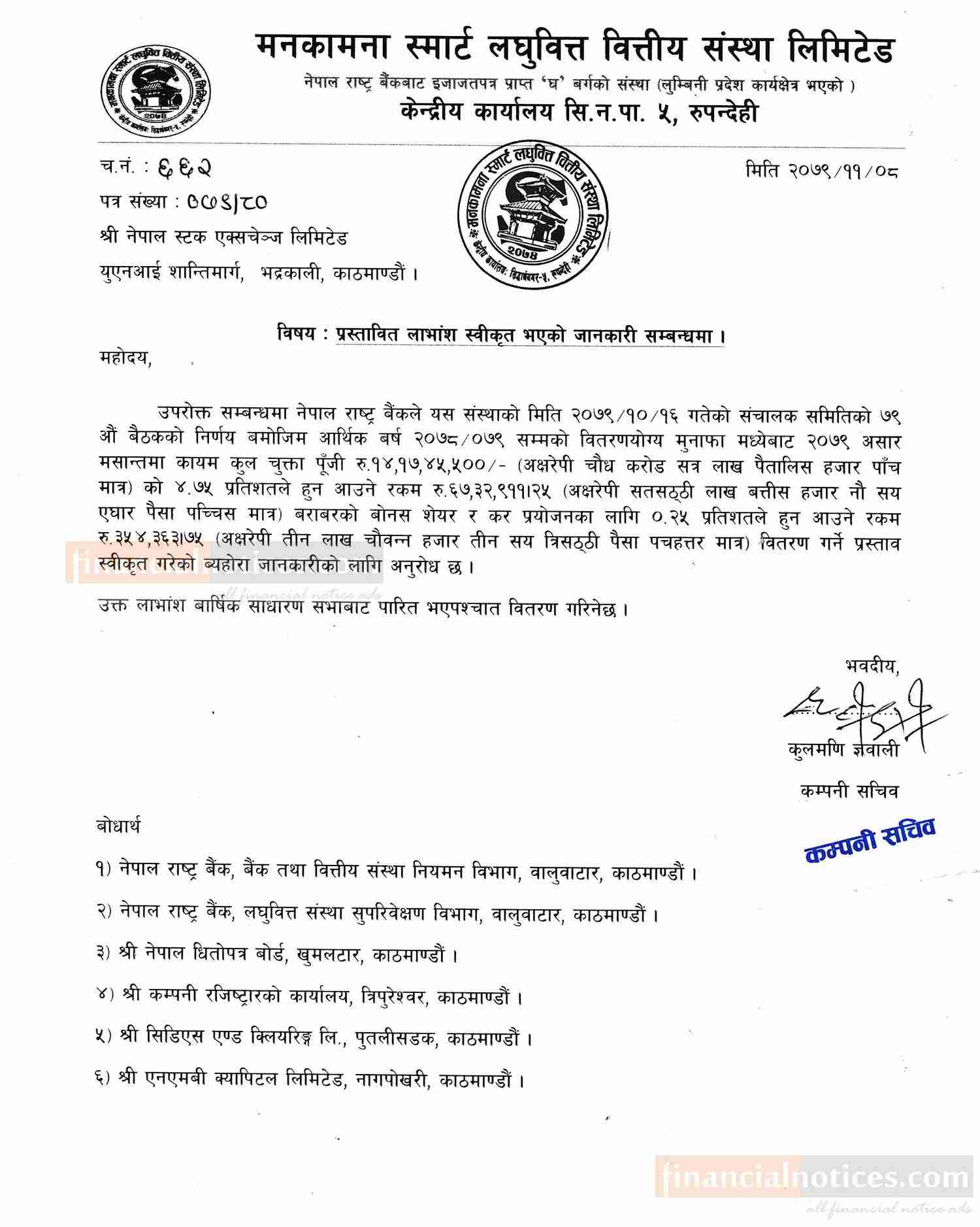 मनकामना स्मार्ट लघुवित्तको लाभांश स्वीकृत भएको सम्बन्धी सूचना