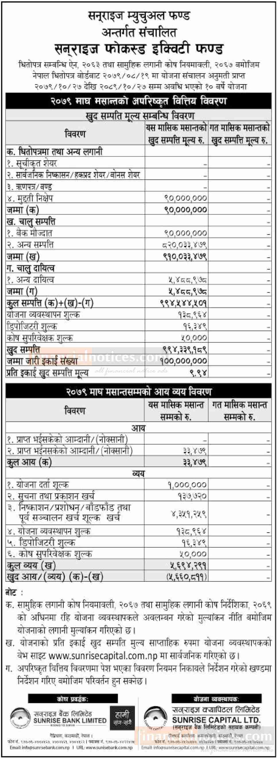 Sunrise Capital has published (Sunrise Focused Equity Fund) Net Assets Value (NAV) till Magh, 2079