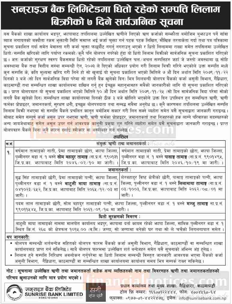 धितोमा रहेको सम्पत्ती लिलाम बिक्री गर्ने सम्बन्धी ७ दिने सूचना