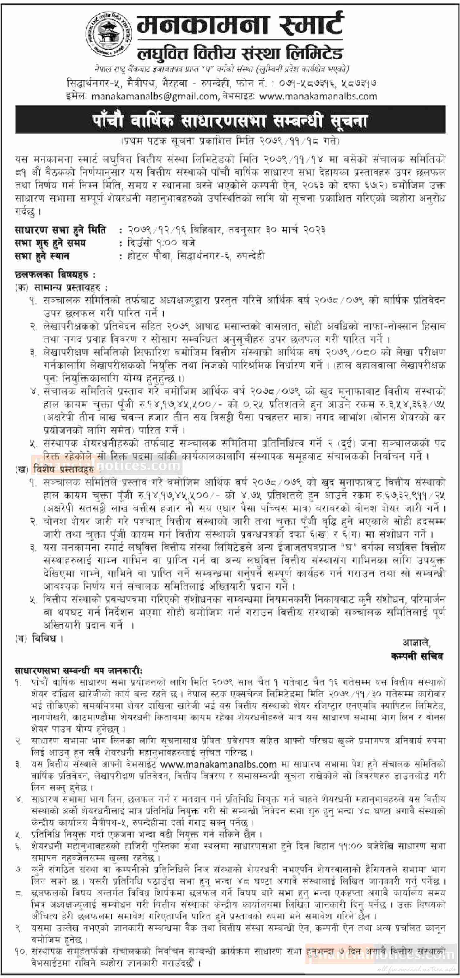 मनकामना स्मार्ट लघुवित्तको पाँचौ वार्षिक साधारण सभा सम्बन्धी सूचना