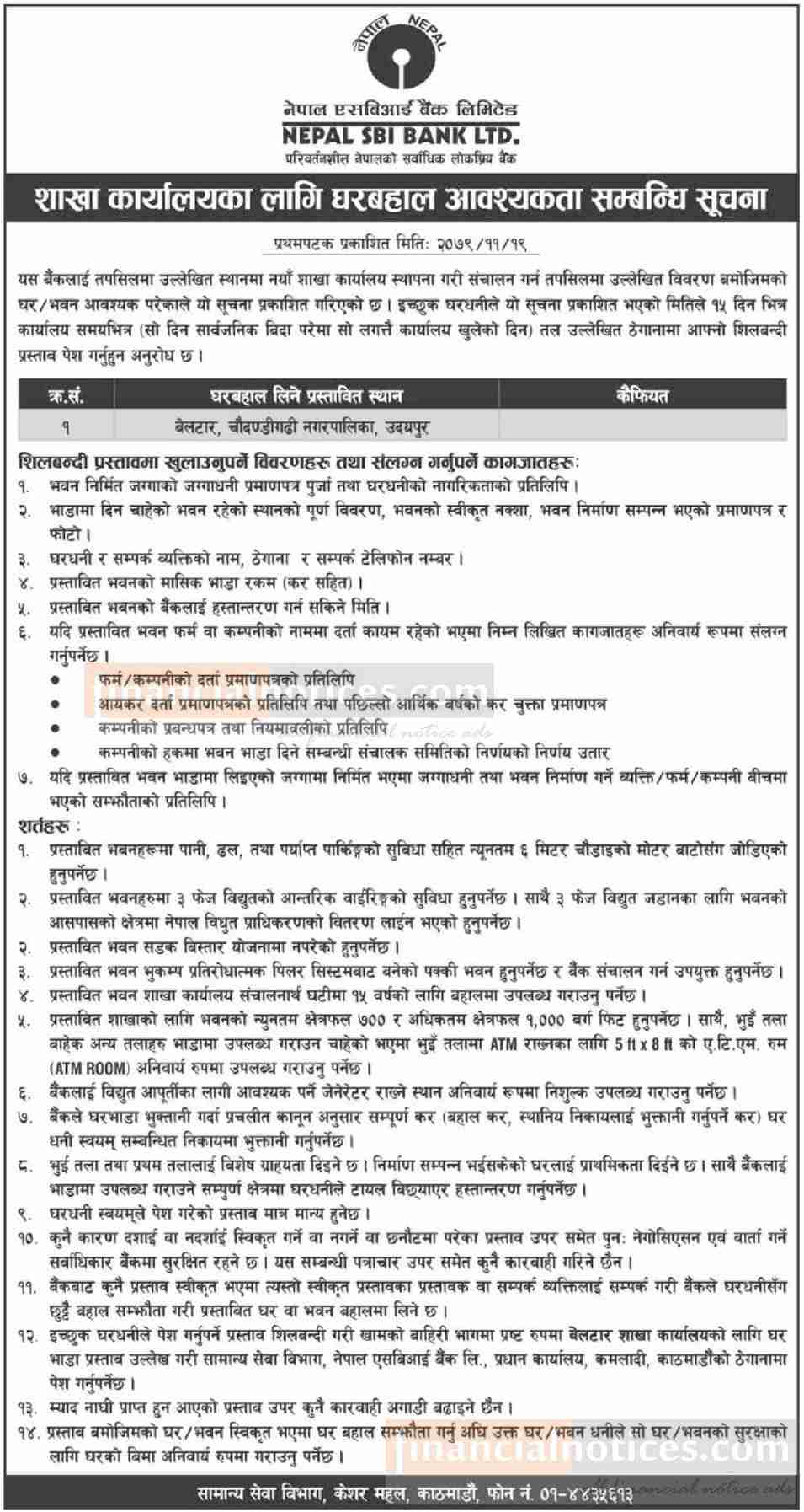 Nepal SBI Bank has announced the need for an office building in Beltar, Chaudandigadi Municipality, Udaipur, to operate a new branch. The bank has issued a notice inviting interested house owners to submit their proposals to the General Services Department of the bank's office in Keshar Mahal, Kathmandu. This notice is valid for 15 days from the date of publication, after which the bank will review the submitted proposals and select the most suitable building for its new branch. Interested parties are advised to provide all necessary information and documents to support their proposals. This announcement by Nepal SBI Bank is likely to create business opportunities for property owners in Beltar, Chaudandigadi Municipality, and provide banking services to the people of the area.