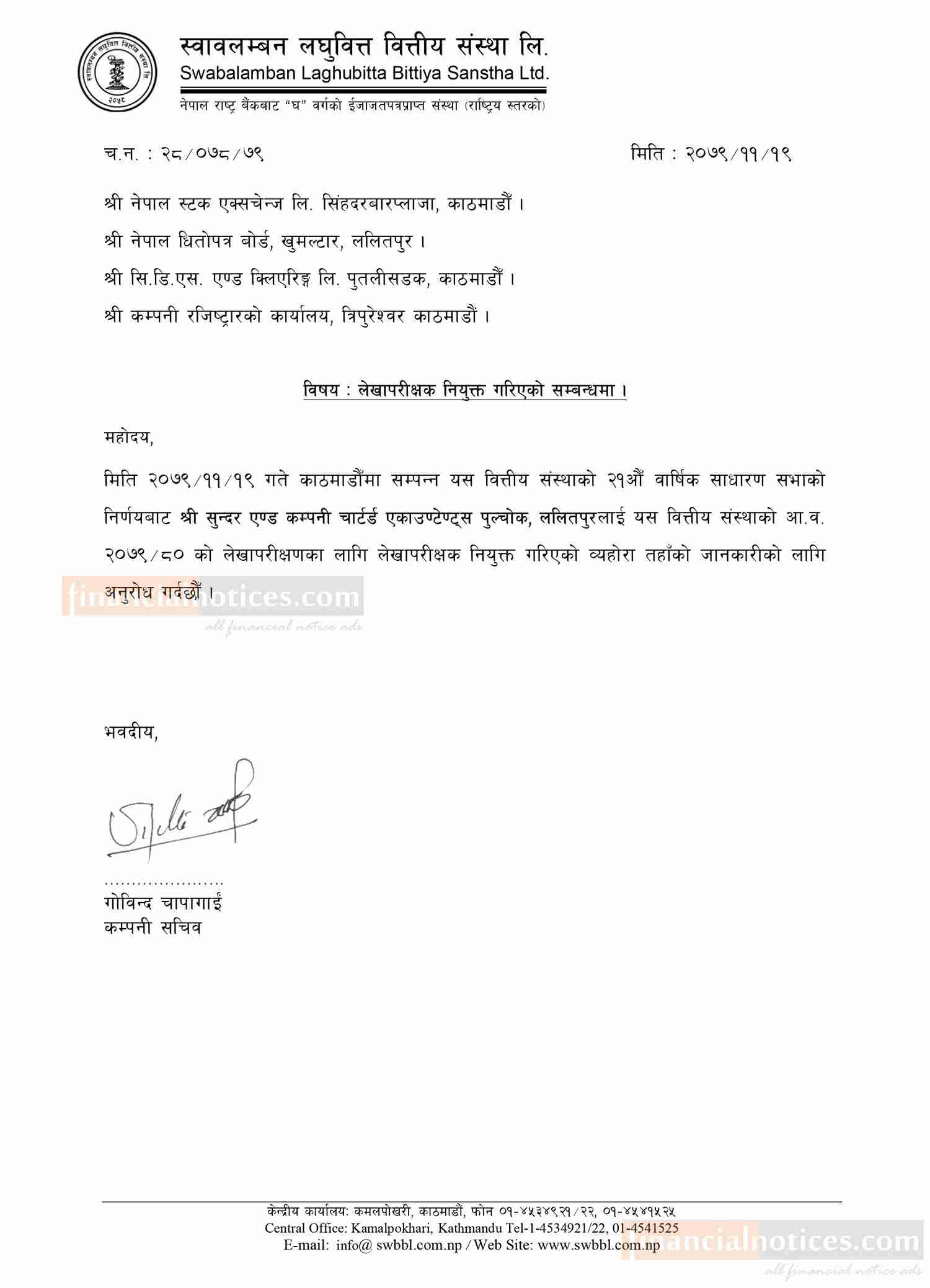 स्वाबलम्बन लघुवित्तको लेखापरिक्षक नियुक्ति सम्बन्धी सूचना