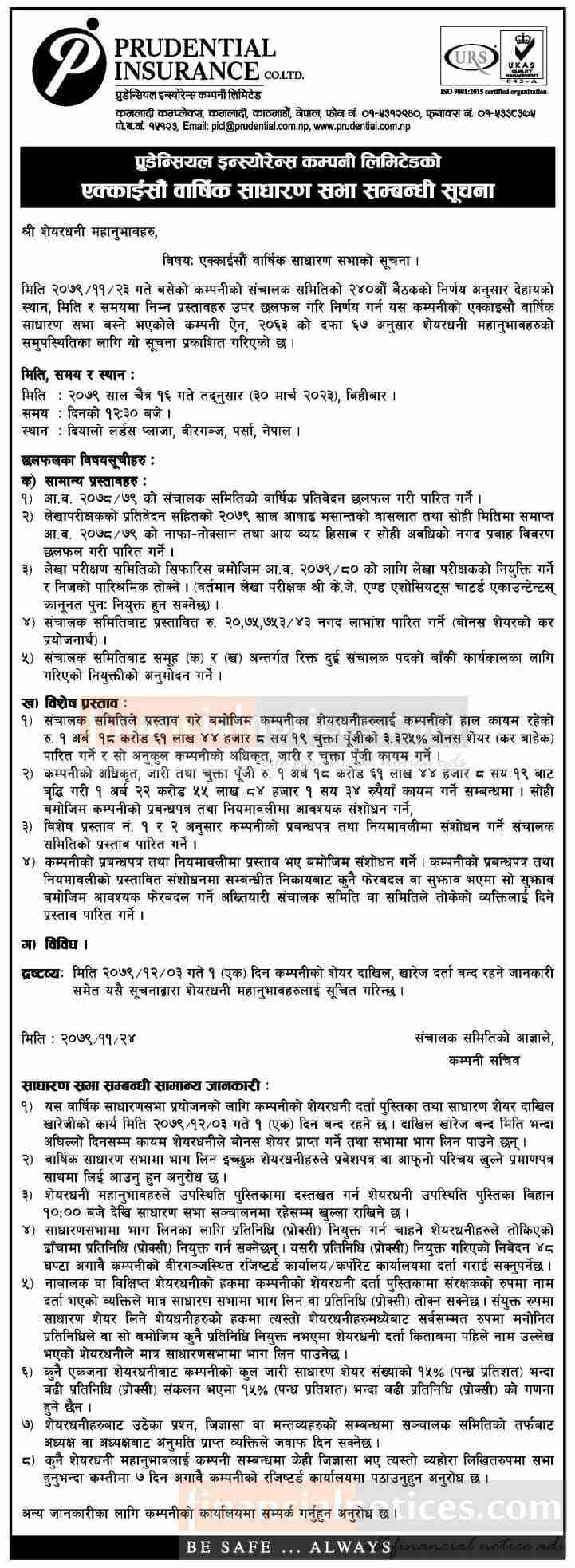 प्रुडेन्सियल इन्स्योरेन्सको २१ औँ वार्षिक साधारण सभा सम्बन्धी सूचना