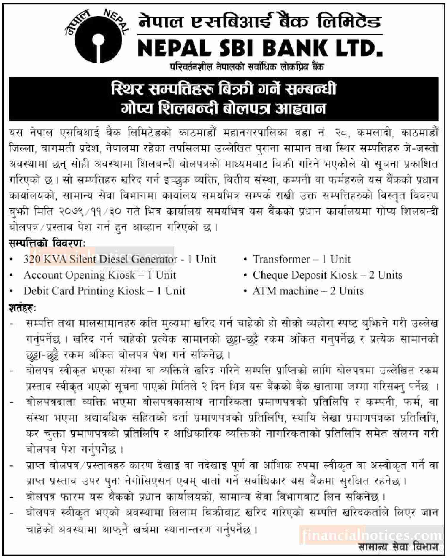 नेपाल एसबिआई बैंकले स्थिर सम्पत्तीहरु लिलाम बिक्री गर्ने सम्बन्धी सूचना