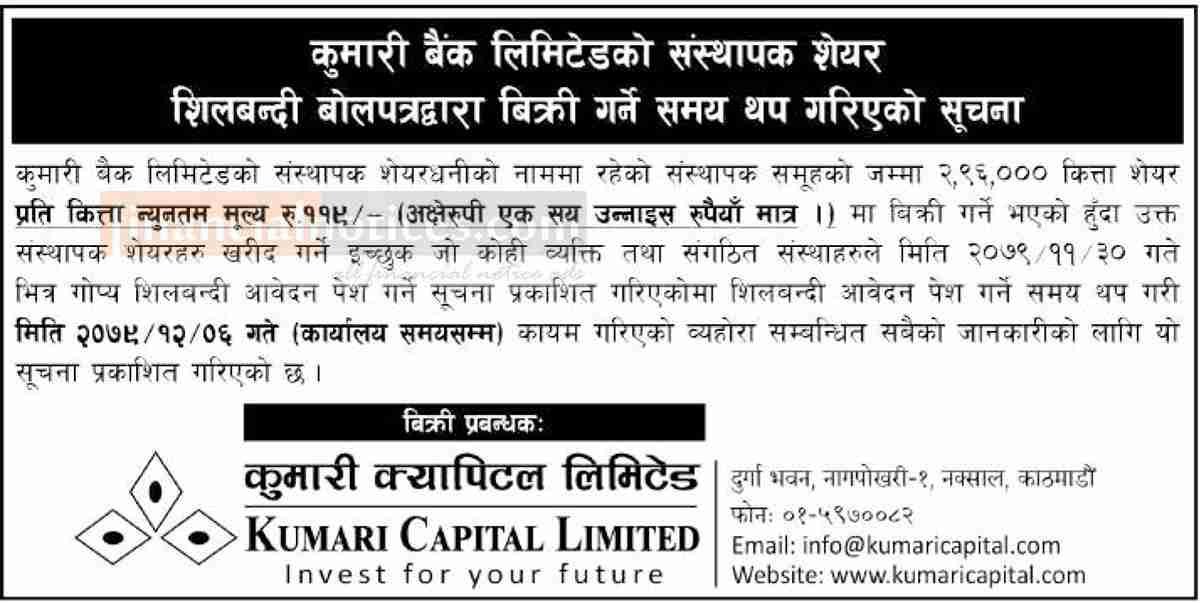 कुमारी बैंकको संस्थापक शेयर शिलबन्दी बोलपत्रद्धारा बिक्री गर्ने समय थप गरिएको बारे सूचना