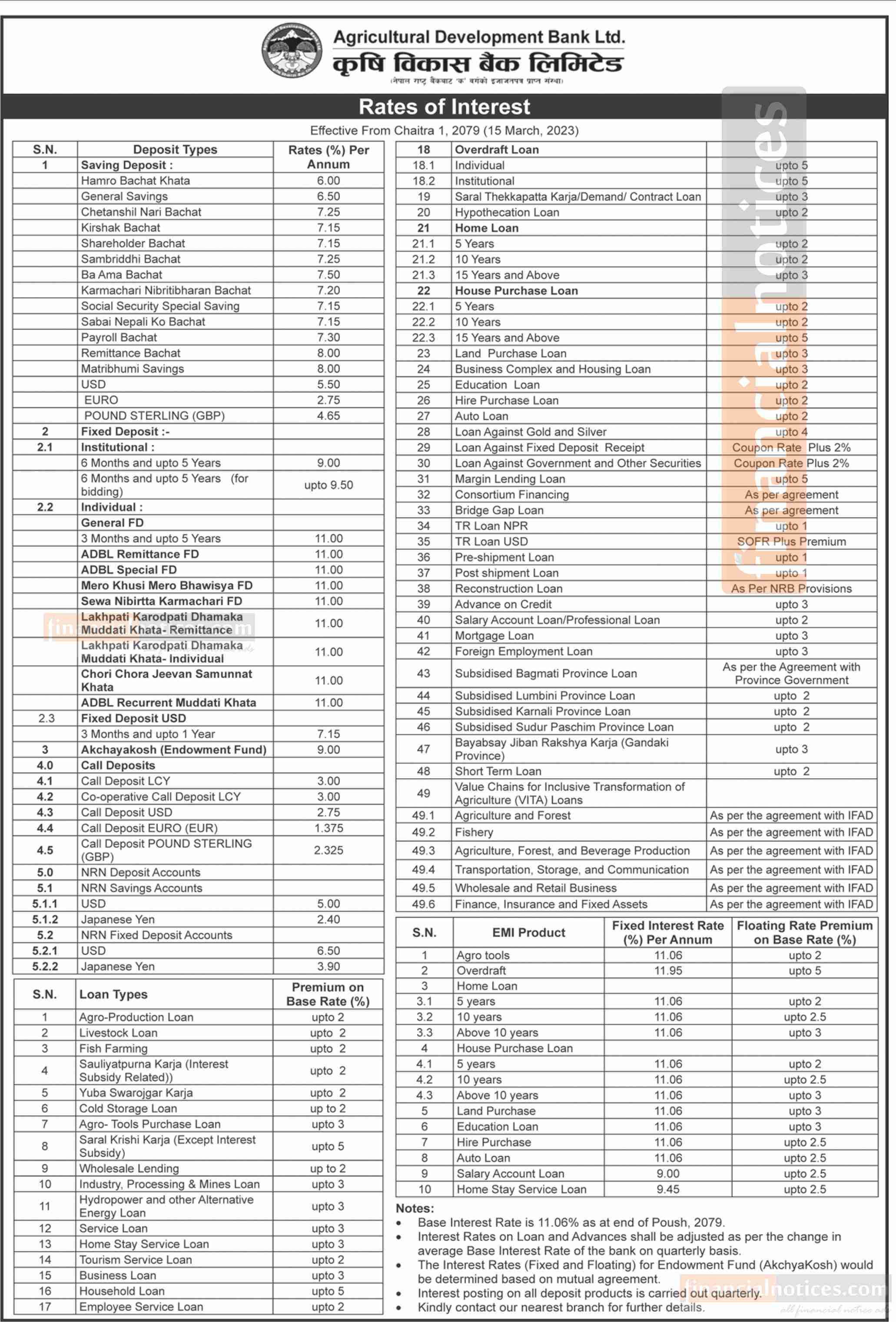 In terms of loans, premium rates on base rates range from 2% to 5% for both premium and overdraft loans. The base interest rate for the bank is 11.06% as of the end of Poush, 2079.
