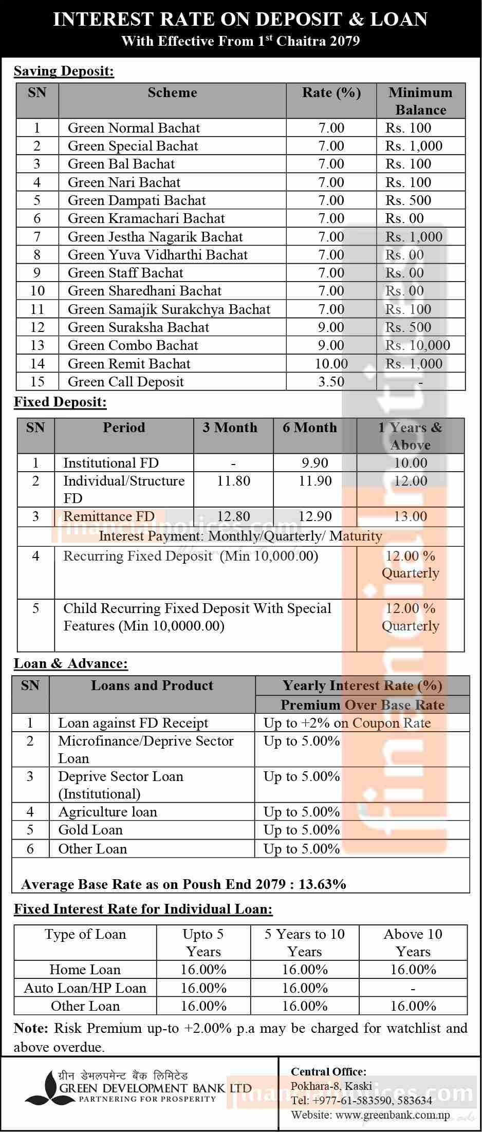 ग्रीन डेभलपमेण्ट बैंकको नयाँ ब्याजदर सार्वजानिक, हेर्नुहोस् कुन खातामा कति पुग्यो ?