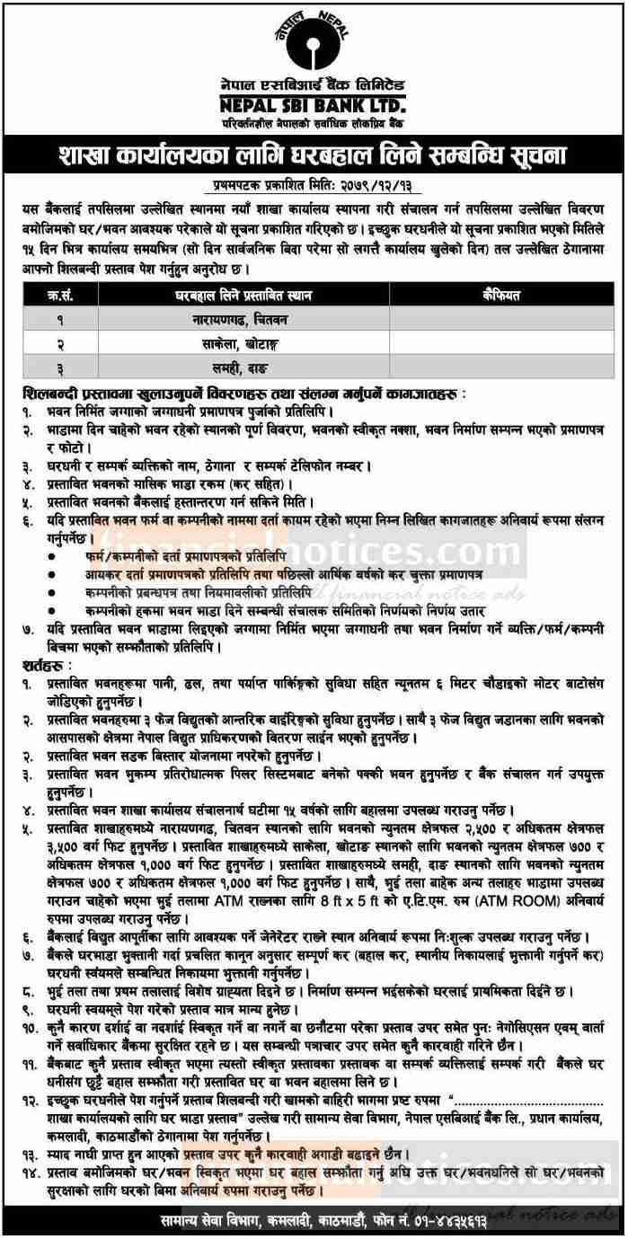 शाखा कार्यालयको लागि घर बहालमा लिने सम्बन्धी सूचना