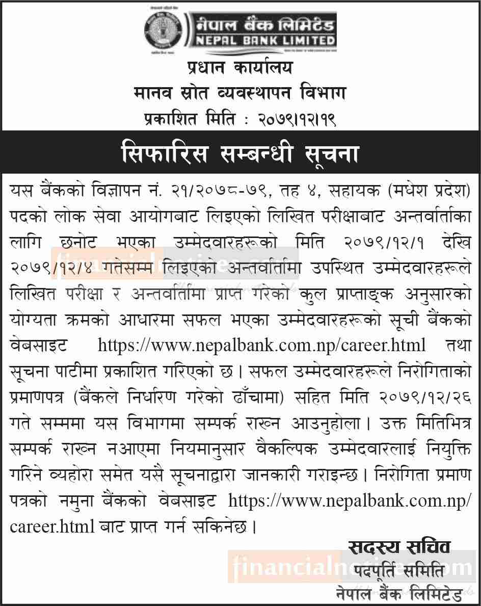 नेपाल बैंकको सिफारीस सम्बन्धी सूचना