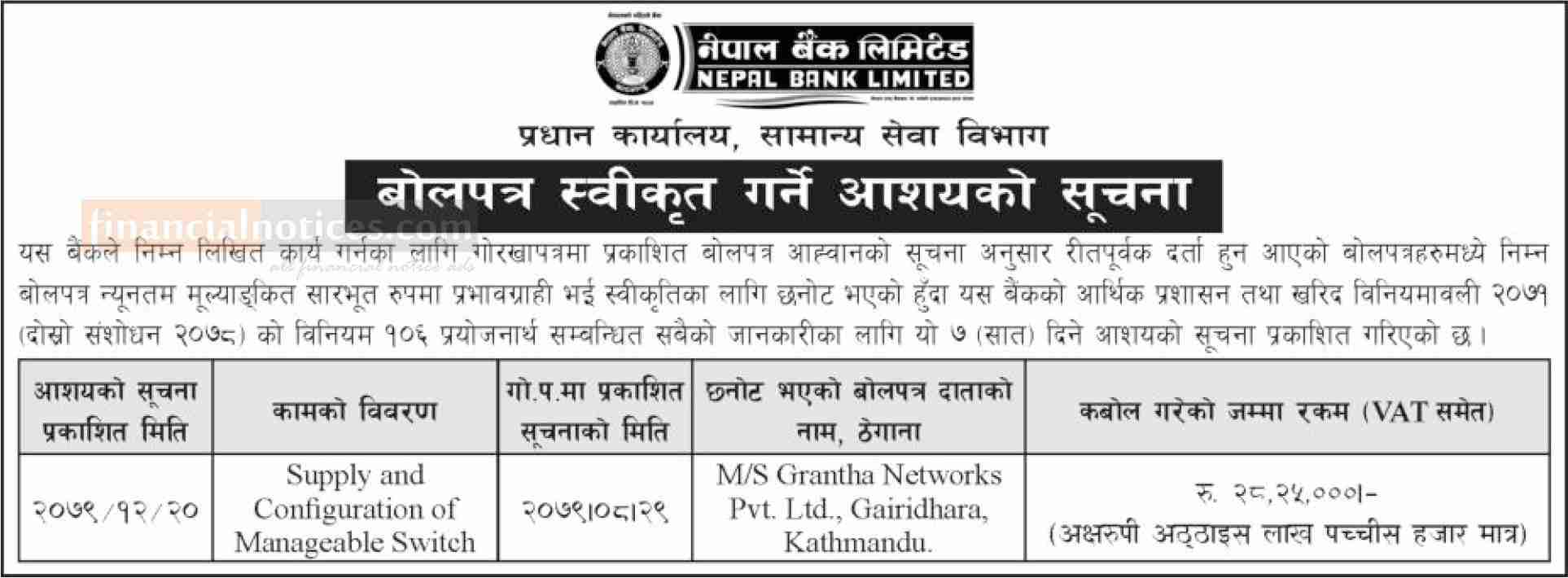नेपाल बैंकको बोलपत्र स्वीकृत गर्ने आशयको सूचना