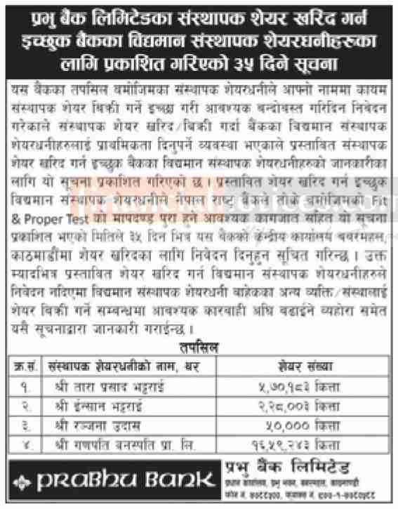 प्रभु बैंकको संस्थापक शेयर खरिद गर्न शेयरधनीहरुलाई जरुरी सूचना