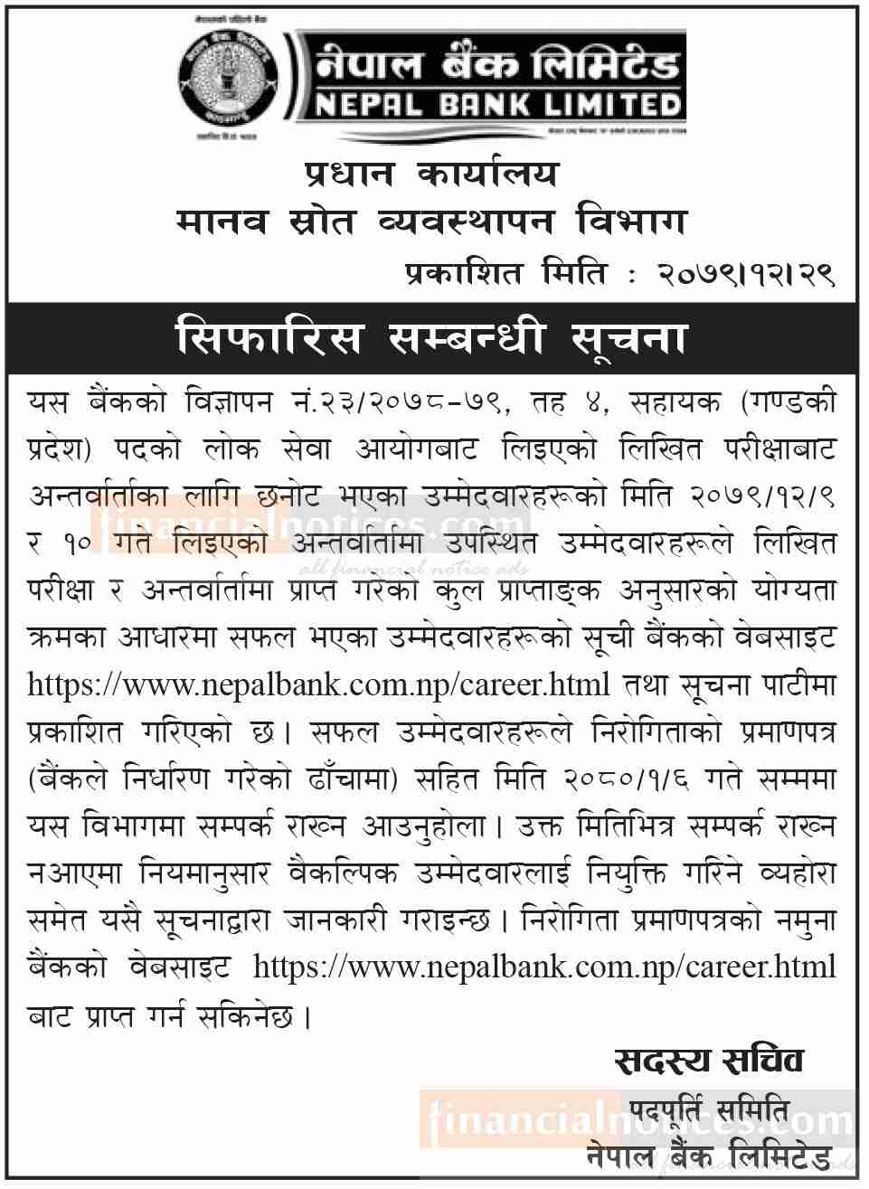 नेपाल बैंकको सिफारिस सम्बन्धी सूचना