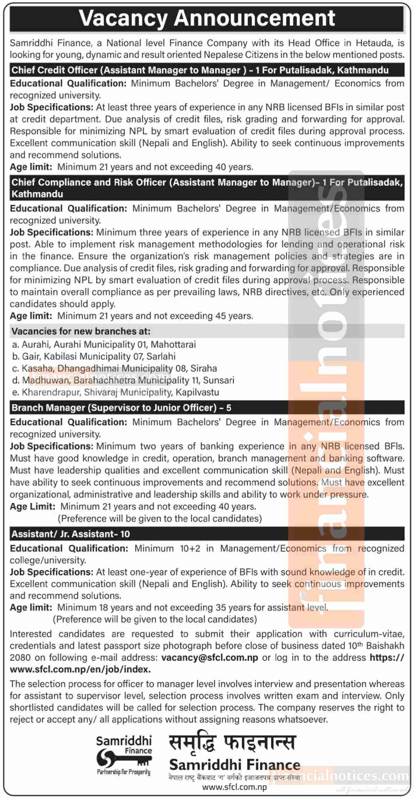 Interested candidates are requested to submit their applications with a curriculum vitae, credentials, and a latest passport-size photograph before close of business on 10th Baishakh 2080 to the following e-mail address: [email protected] or log in to the address https://www.sfcl.com.np/en/job/index. The selection process for officer to manager level involves an interview and presentation, while for assistant to supervisor level, it involves a written exam and interview. Only shortlisted candidates will be called for the selection process. The company reserves the right to reject or accept any/all applications without assigning reasons whatsoever.