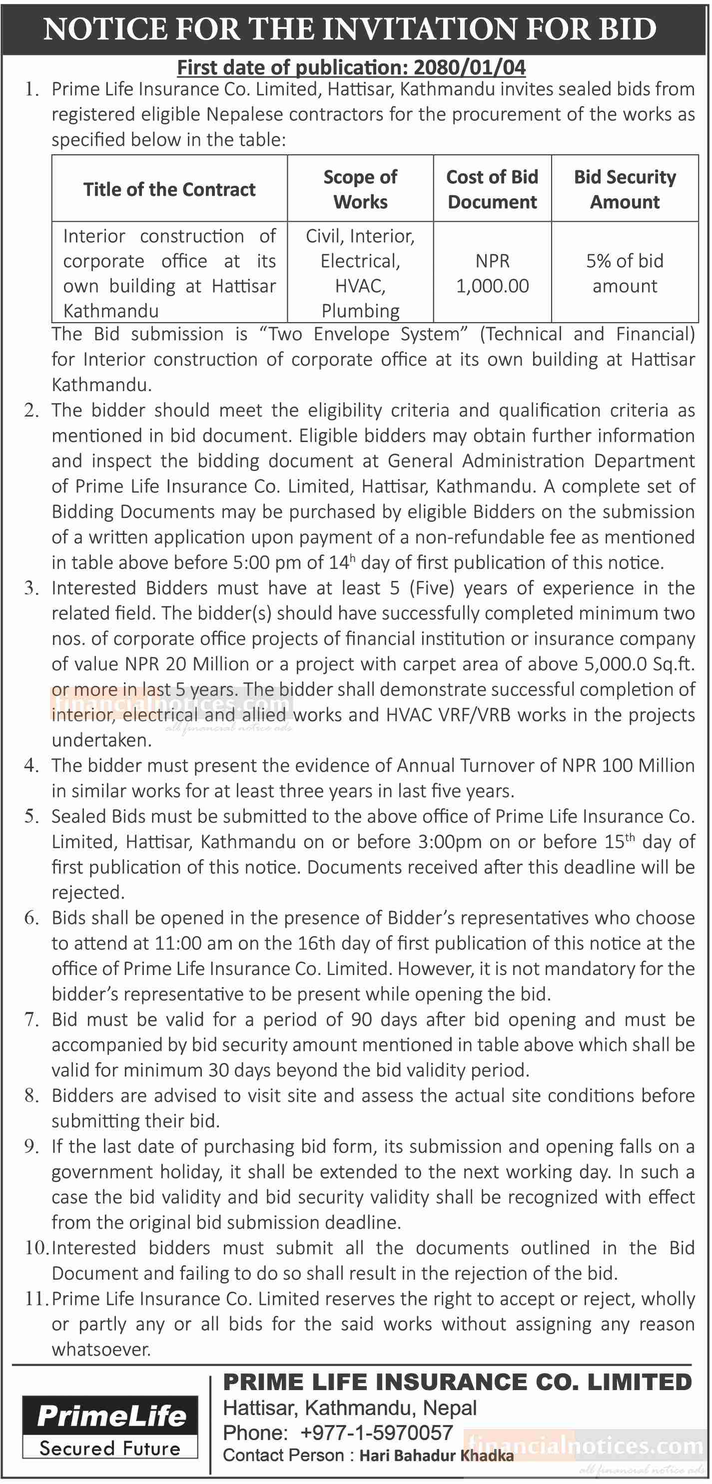 बोलपत्र स्वीकृतिका लागि छनोट गर्ने आशयको सूचना