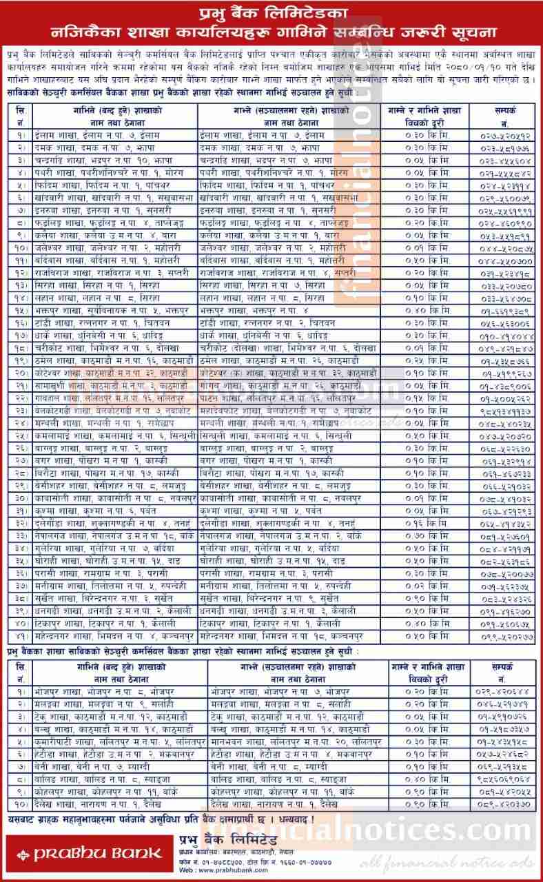 Prabhu Bank, one of the leading commercial banks in Nepal, has announced that it will merge its nearby branch offices, effective from the 10th of Baisakh 2080. In a notice issued today, the bank has listed the names of the merged branches and informed us that the branch offices located at the same location will be adjusted after the acquisition of the former Century Bank.