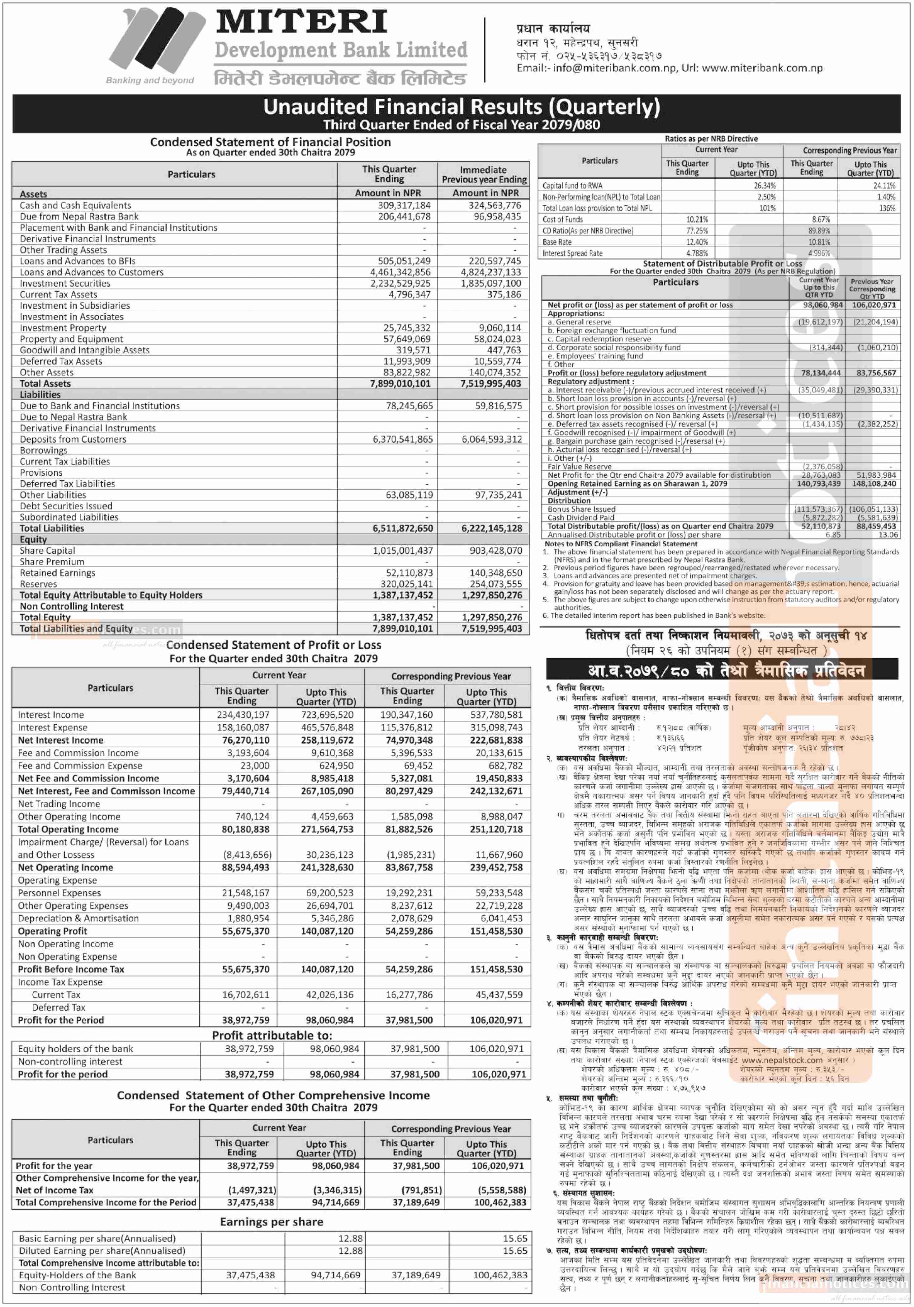 मितेरी डेभलपमेन्ट बैंकको खुद नाफा ९ करोड ८० लाख रुपैयाँ