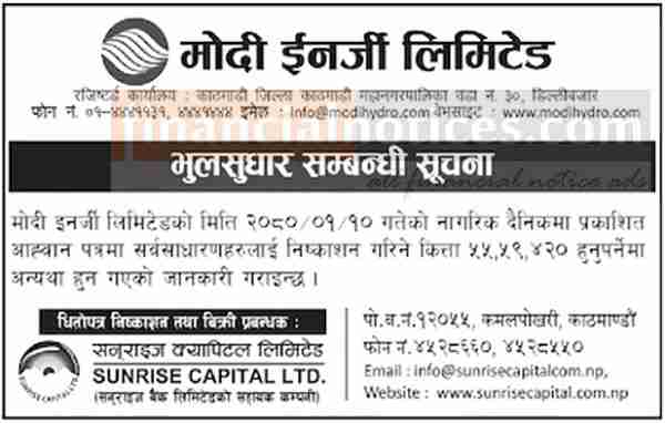 मोदि इनर्जीको आईपीओ को भुलसुधार सम्बन्धी सूचना