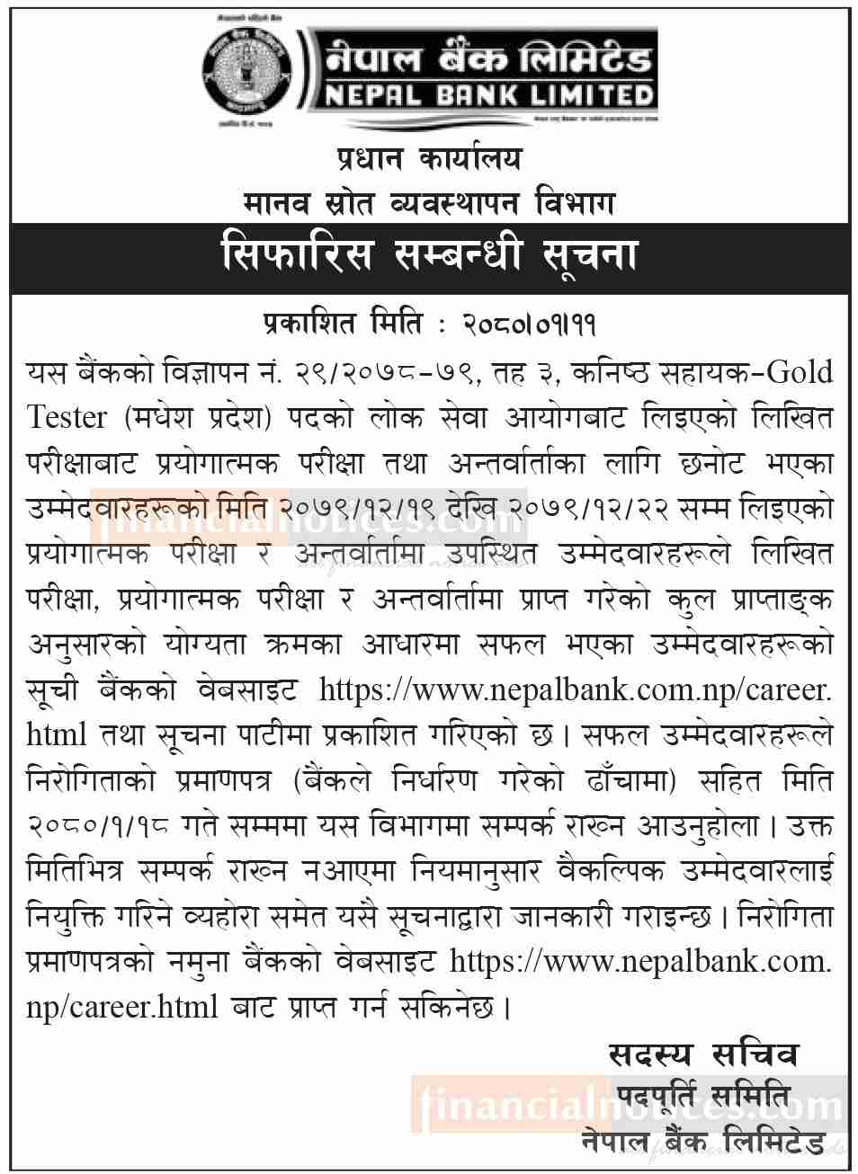 नेपाल बैंकको सिफारिस सम्बन्धी सूचना